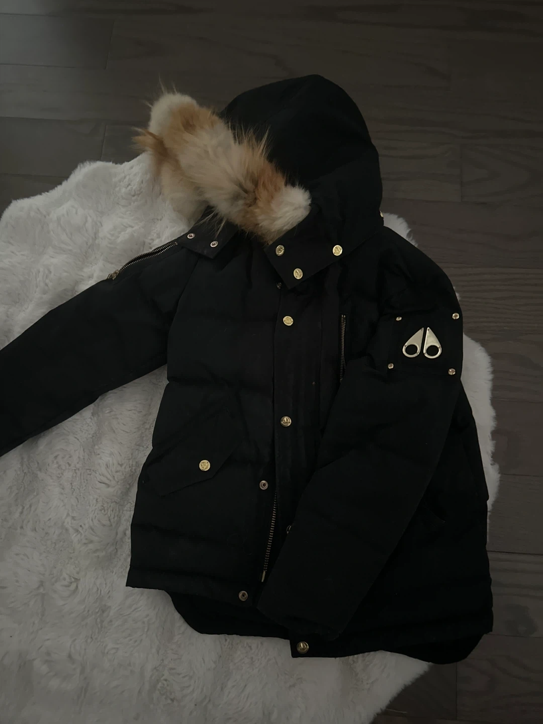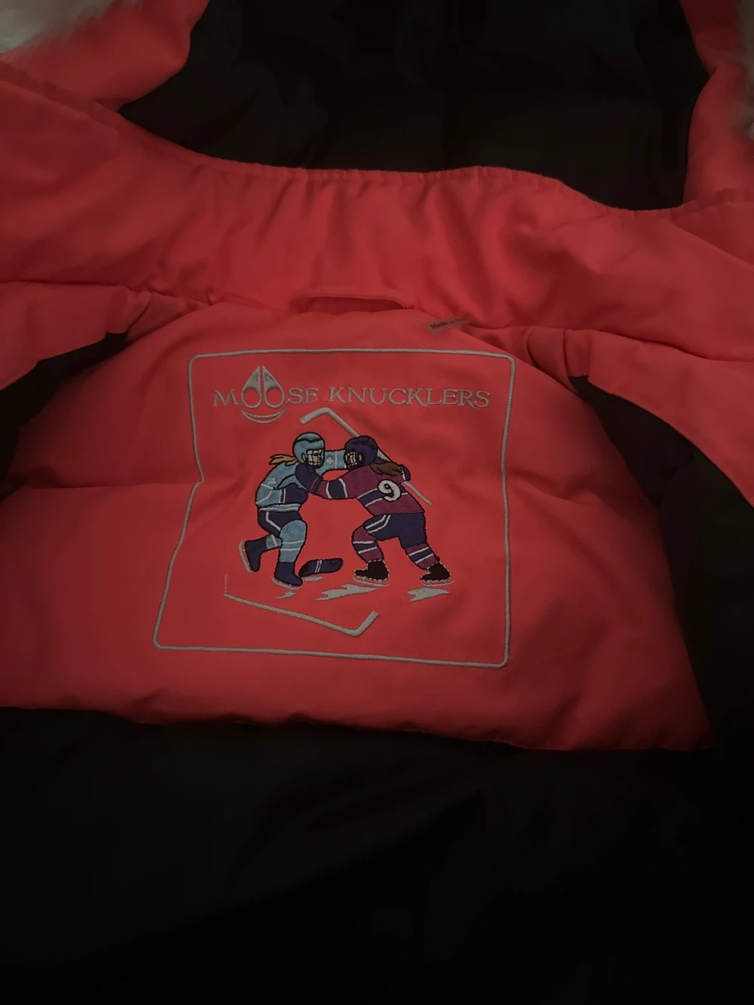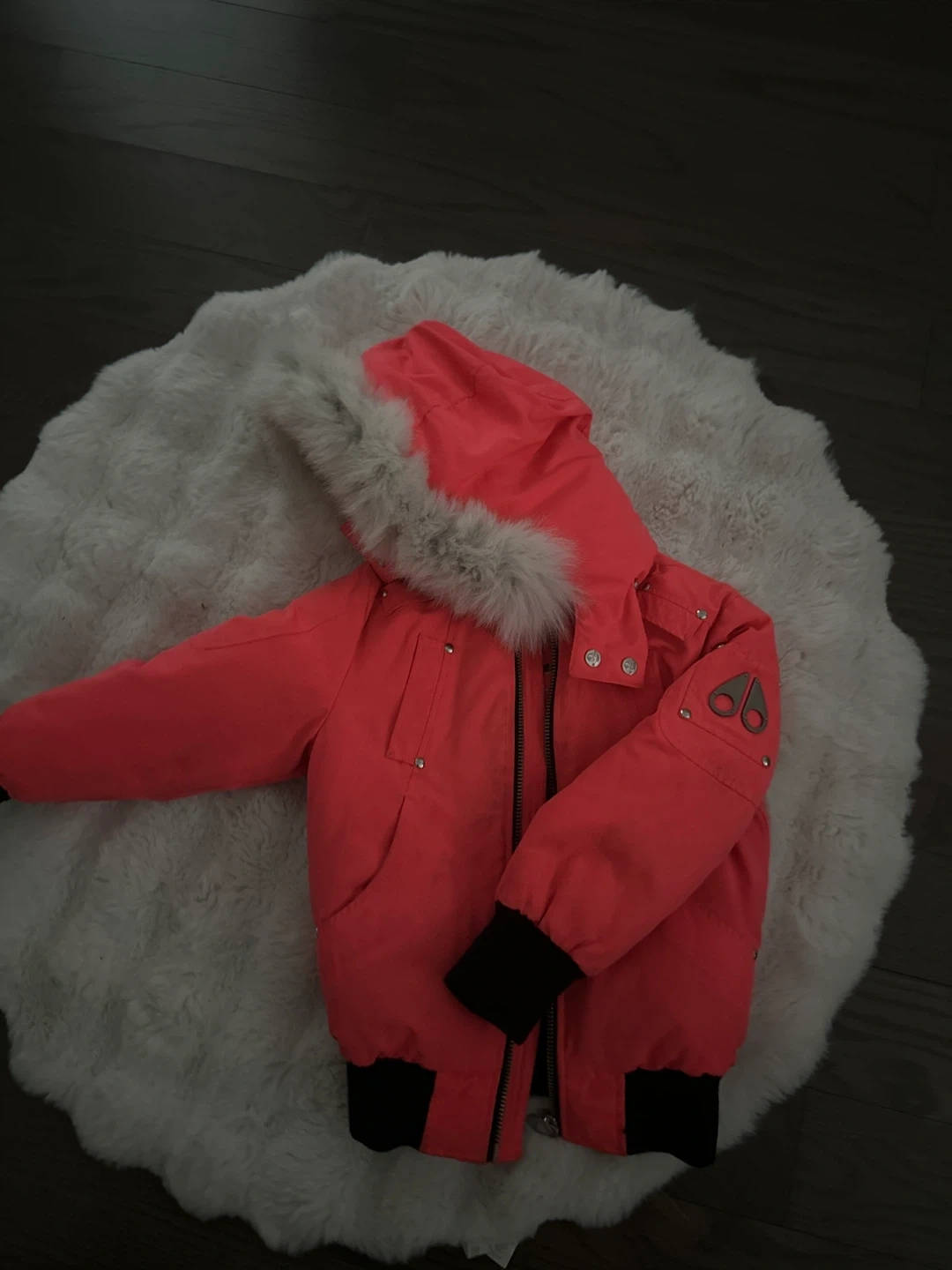 Two Moose Knuckles kids jackets, one black and one bright pink. Both feature fur-trimmed hoods and the signature Moose Knuckles logo. Great for keeping little ones warm and stylish! Each one is 250