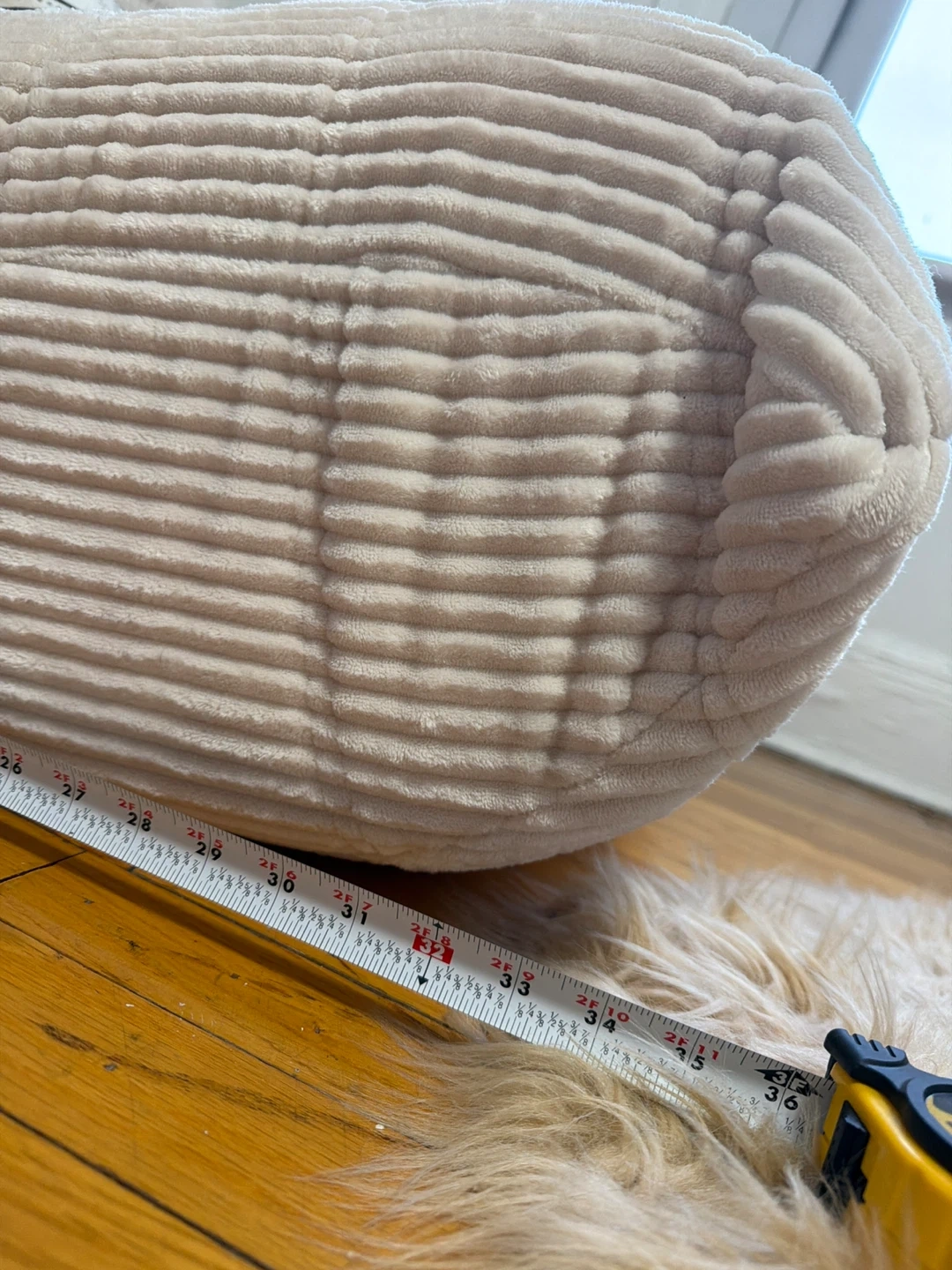 NEEDS TO GO THIS WEEK! This cream-colored bean bag chair features a soft corduroy fabric. The chair measures approximately 29 inches in height when fully propped.