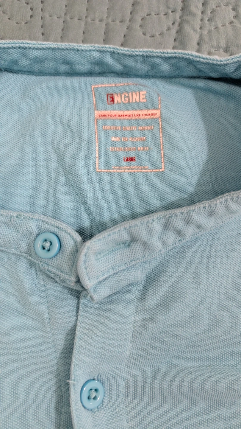 This ENGINE shirt is a light blue colour with a banded collar. It's made of a textured knit fabric. It has a button-up front.