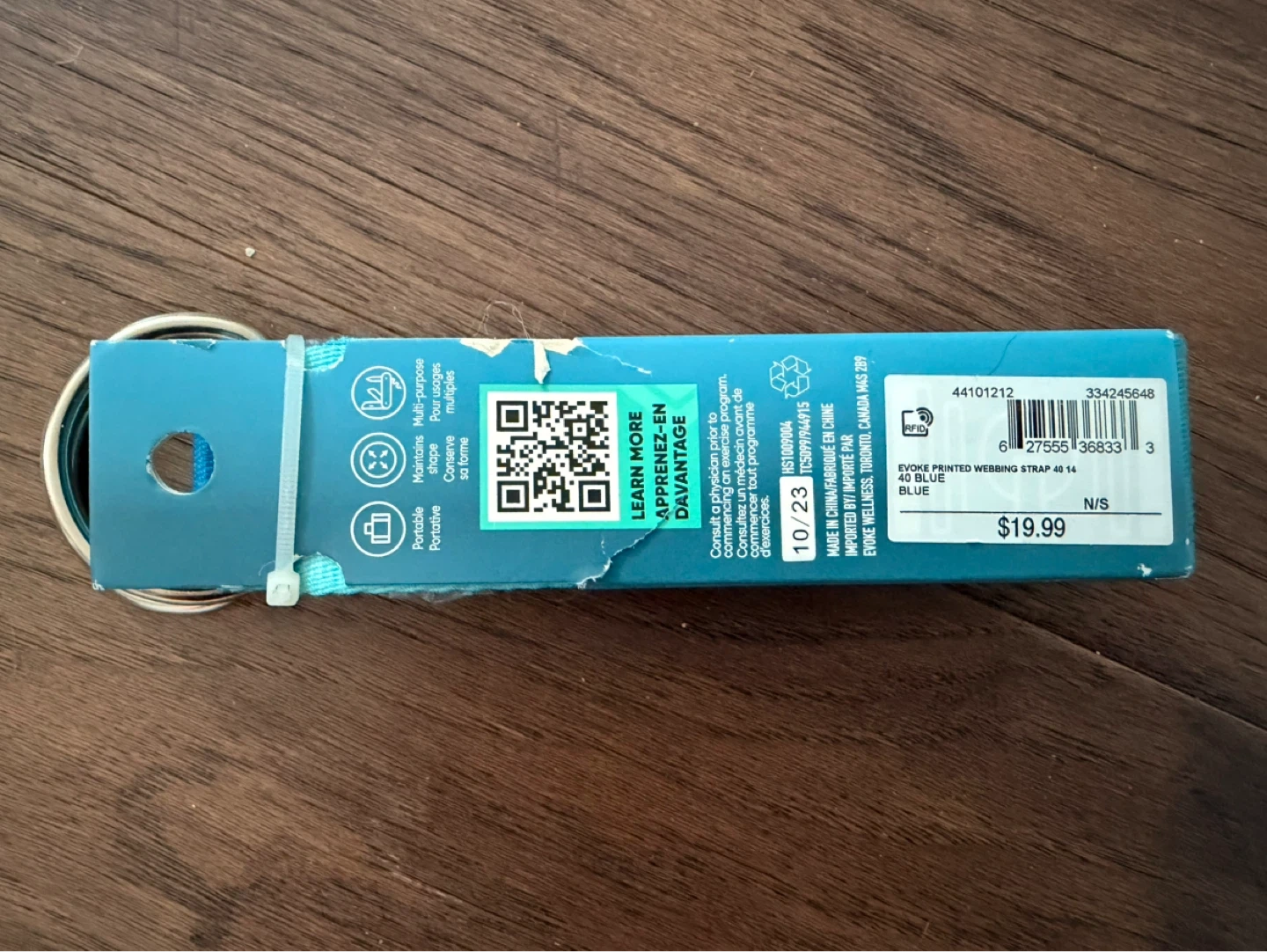 EVOKE yoga strap in blue. It's 246 cm long and 3.8 cm wide. Portable and multi-purpose for various exercises.