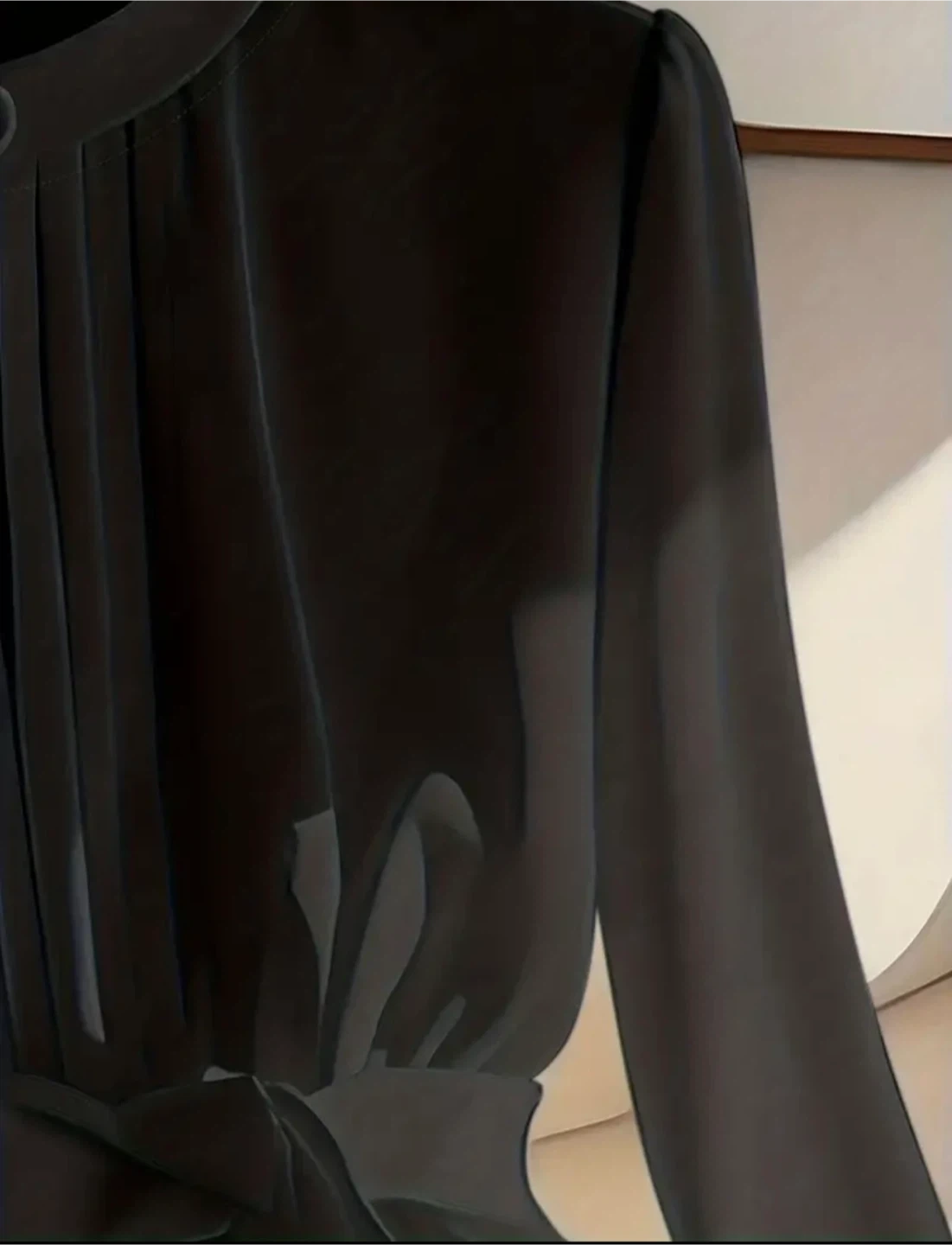 A chic black long-sleeve blouse. It features elegant pleating down the front and a matching tie belt at the waist. The fabric looks like a lightweight chiffon.