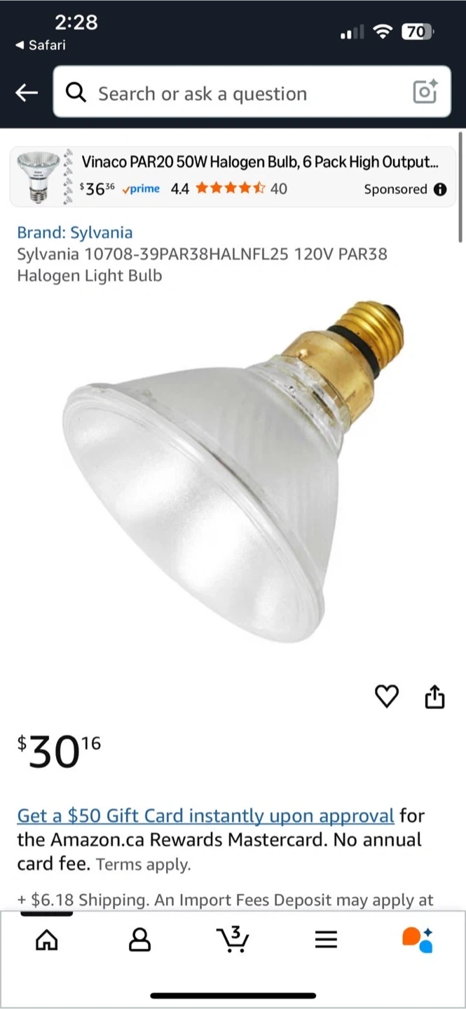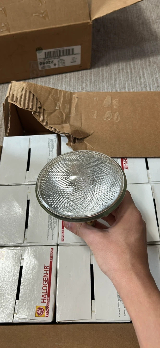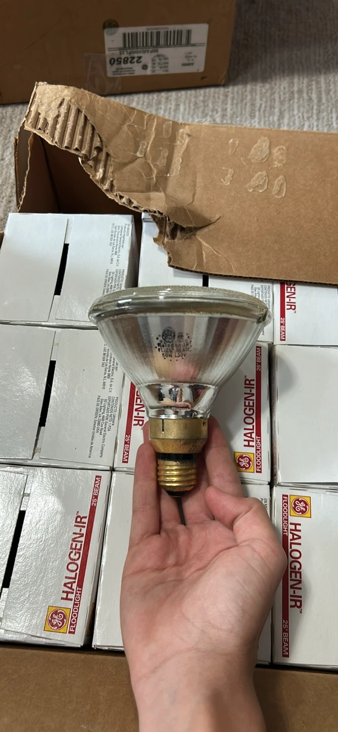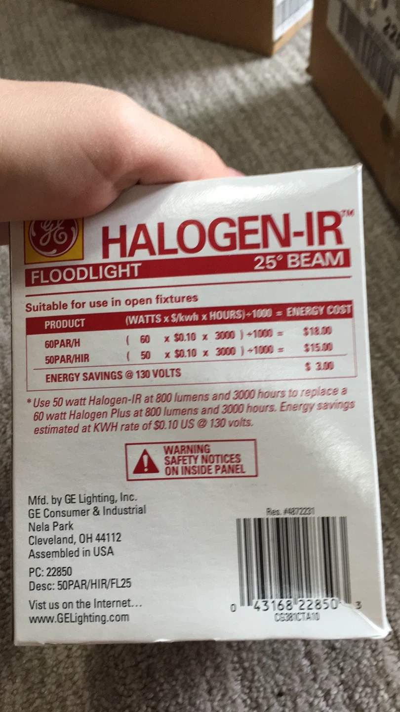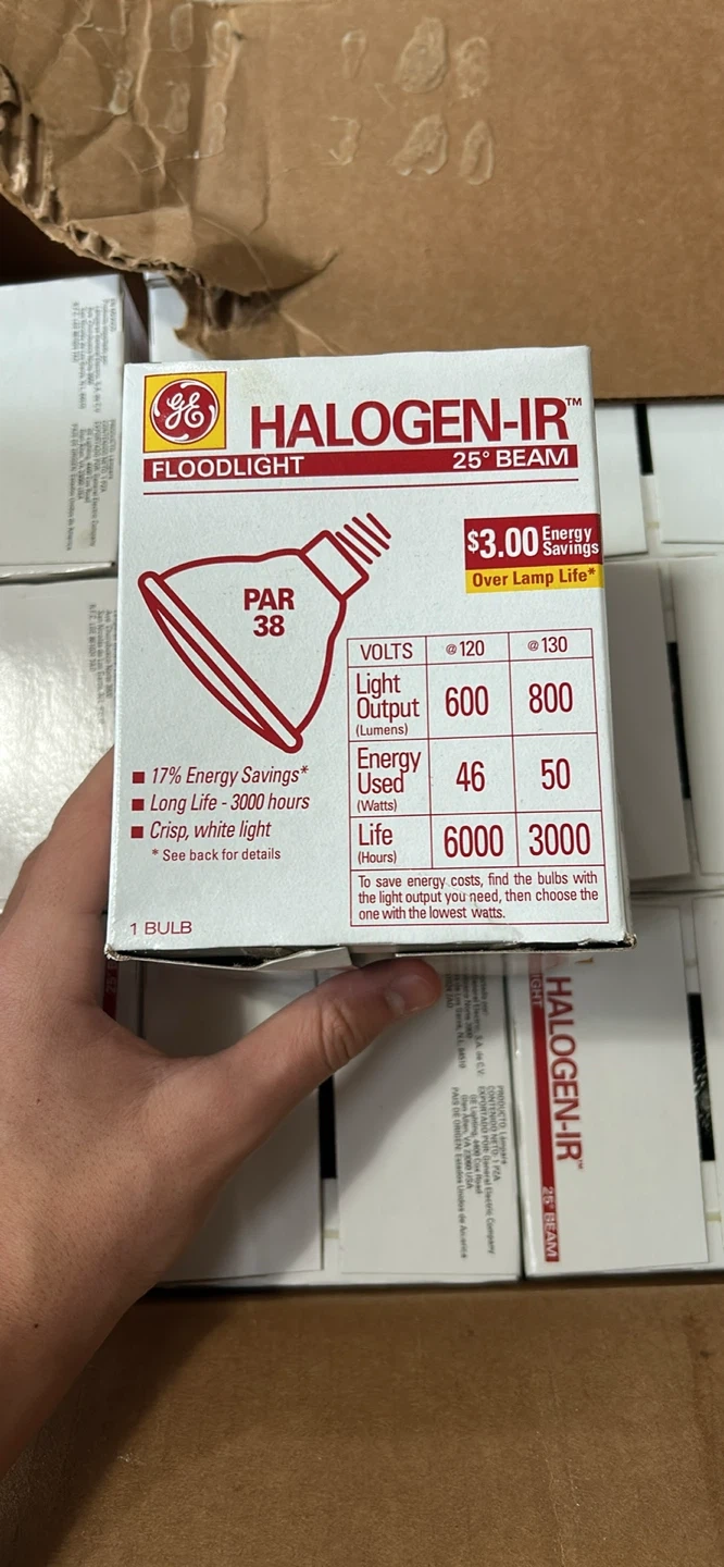 Selling a GE Halogen-IR Floodlight, PAR38. The box says it has 17% energy savings and a long life of 3000 hours. It provides a crisp, white light. The light output is 600 lumens at 120 volts and 800 lumens at 130 volts. Energy used is 46 watts at 120 volts and 50 watts at 130 volts. The life is 6000 hours at 120 volts and 3000 hours at 130 volts