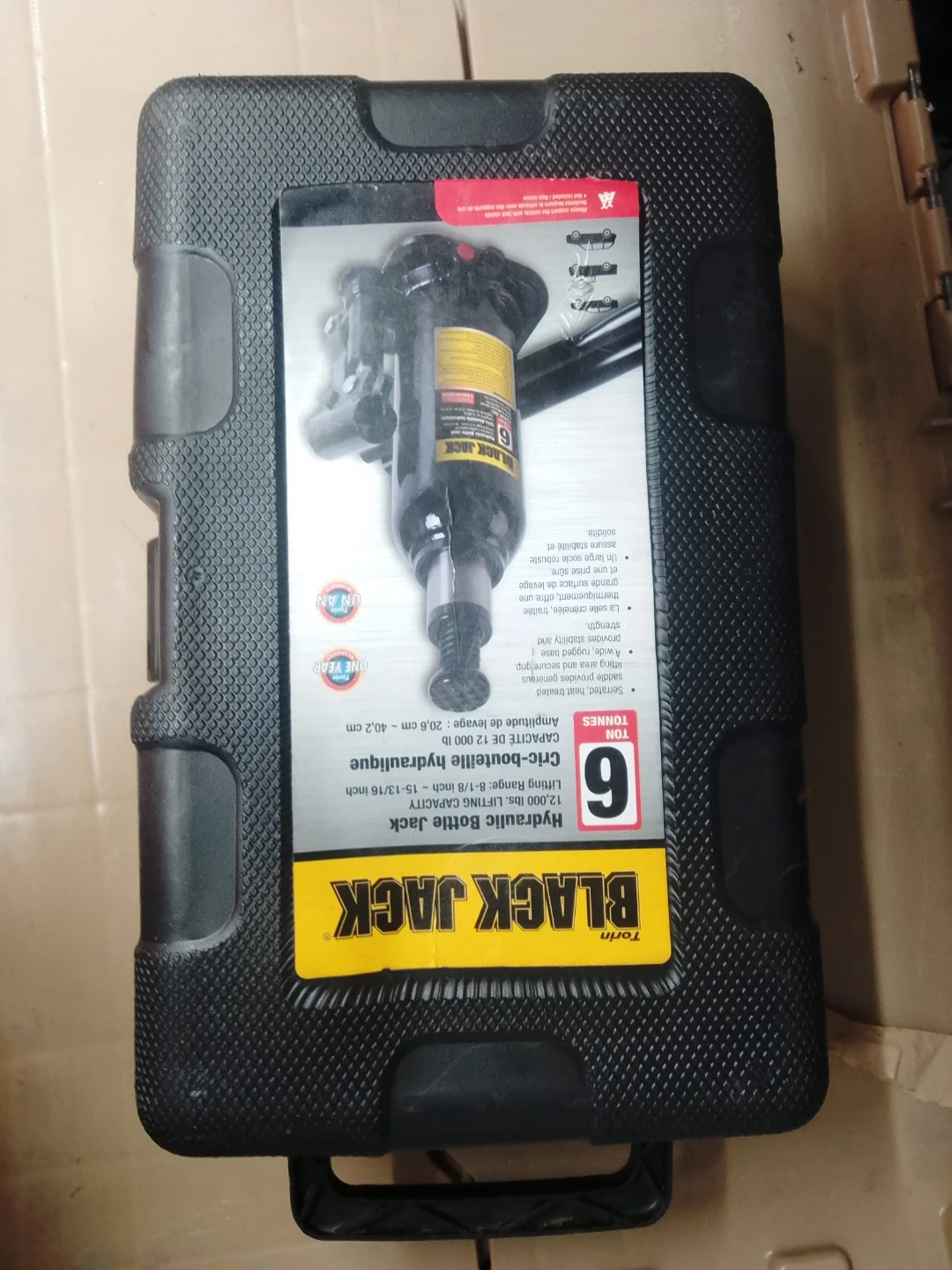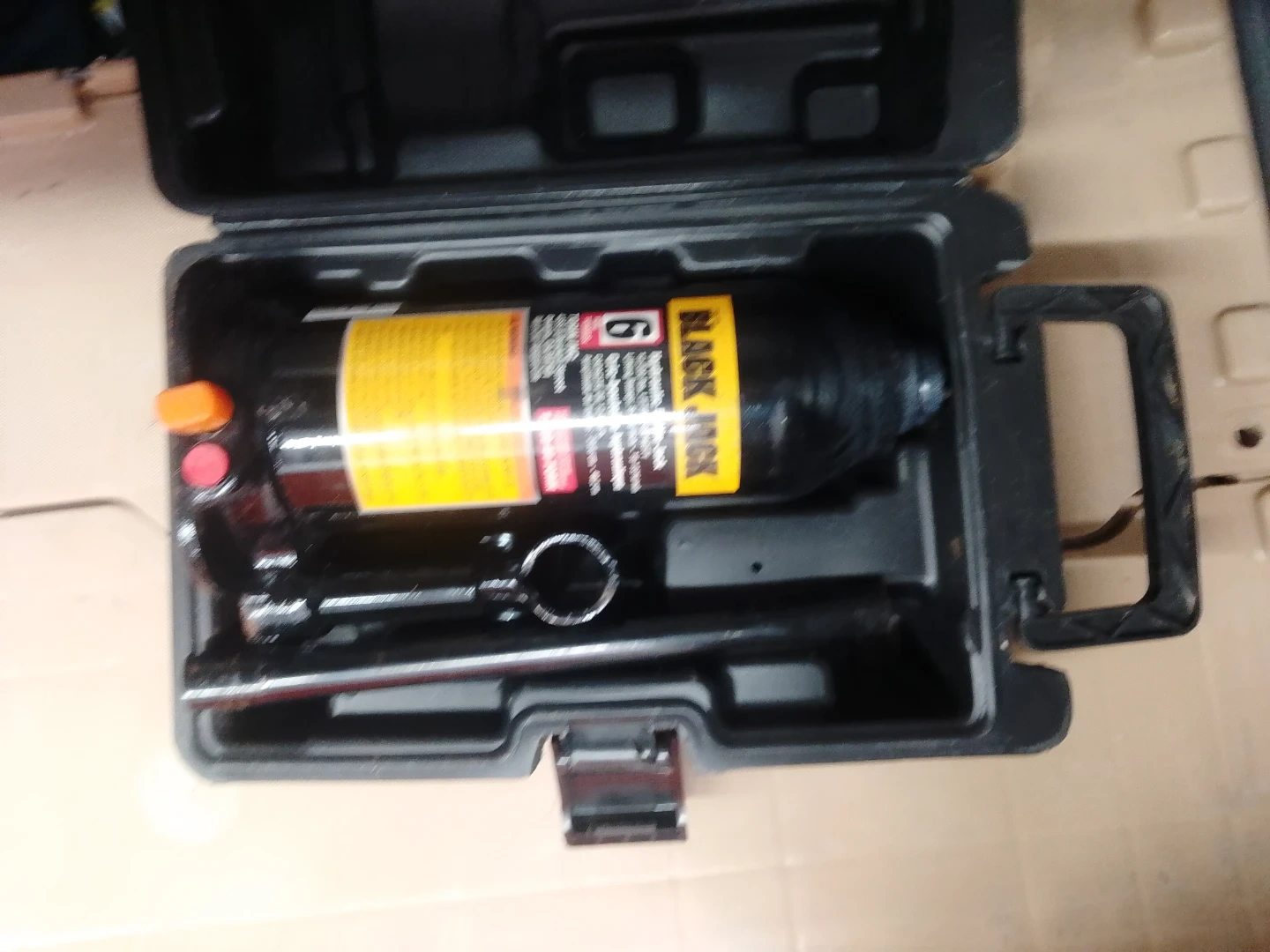 This is a BLACK JACK hydraulic bottle jack. It has a 6-ton lifting capacity and includes a carrying case with some tools. This jack is useful for lifting vehicles for maintenance or repairs.