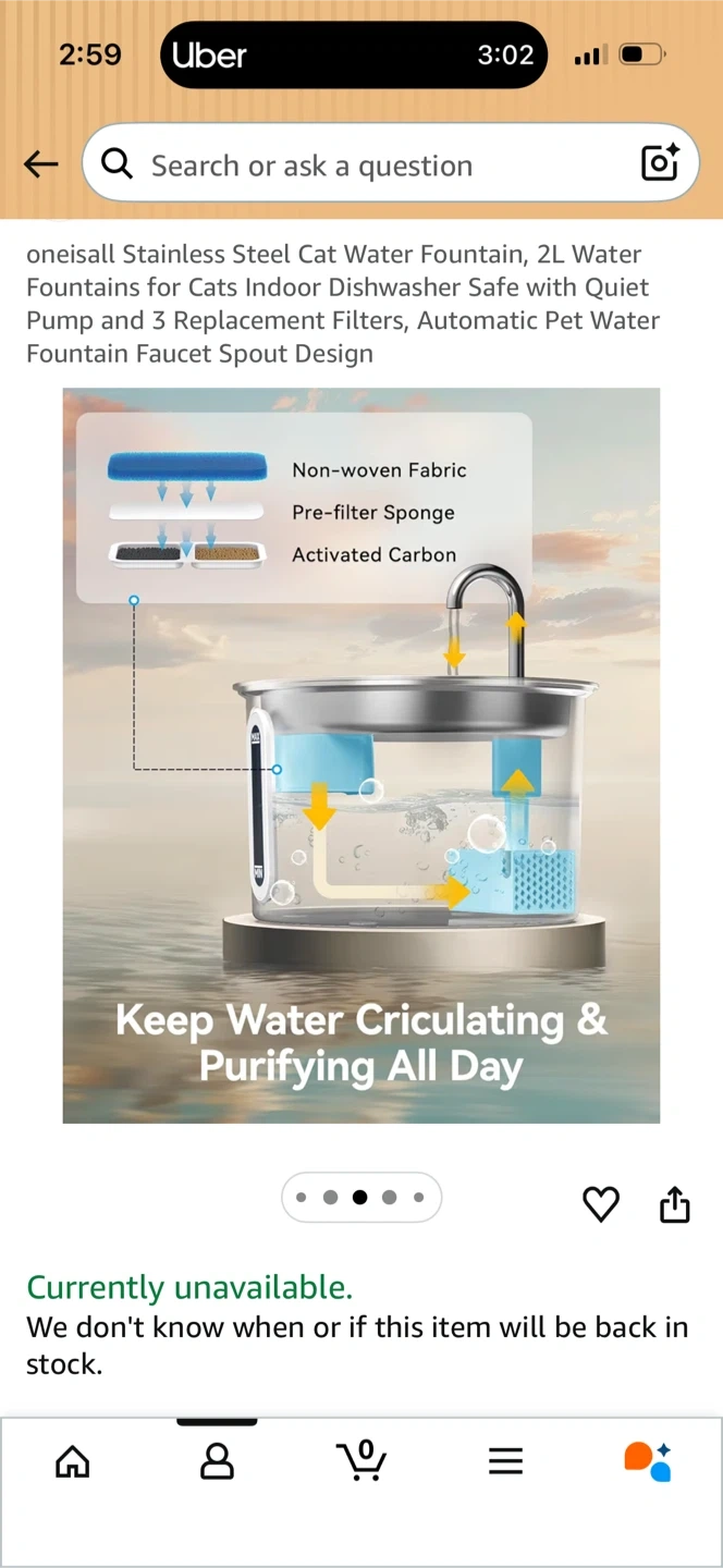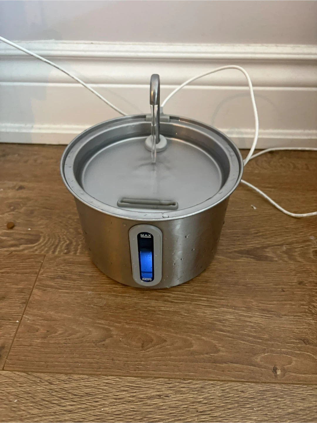 This is a 2L stainless steel cat water fountain. It's dishwasher safe and has a quiet pump. Includes 3 replacement filters and automatic pet water fountain faucet spout design. Keeps water circulating and purifying all day!