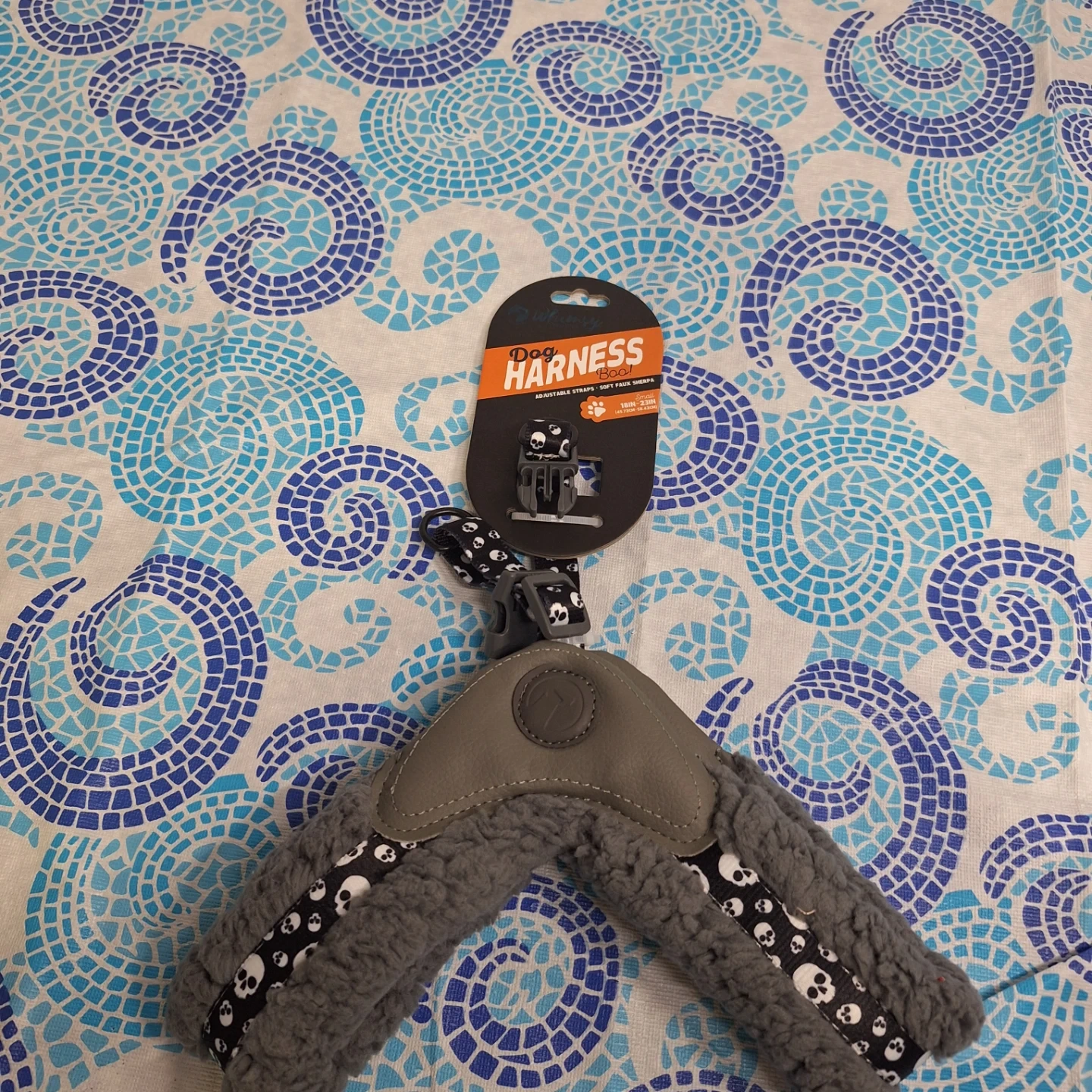 This is a small-sized Ruffwear dog harness in grey with a skull pattern. It's lightweight, durable, and has adjustable straps. Great for walks and hikes with your dog!