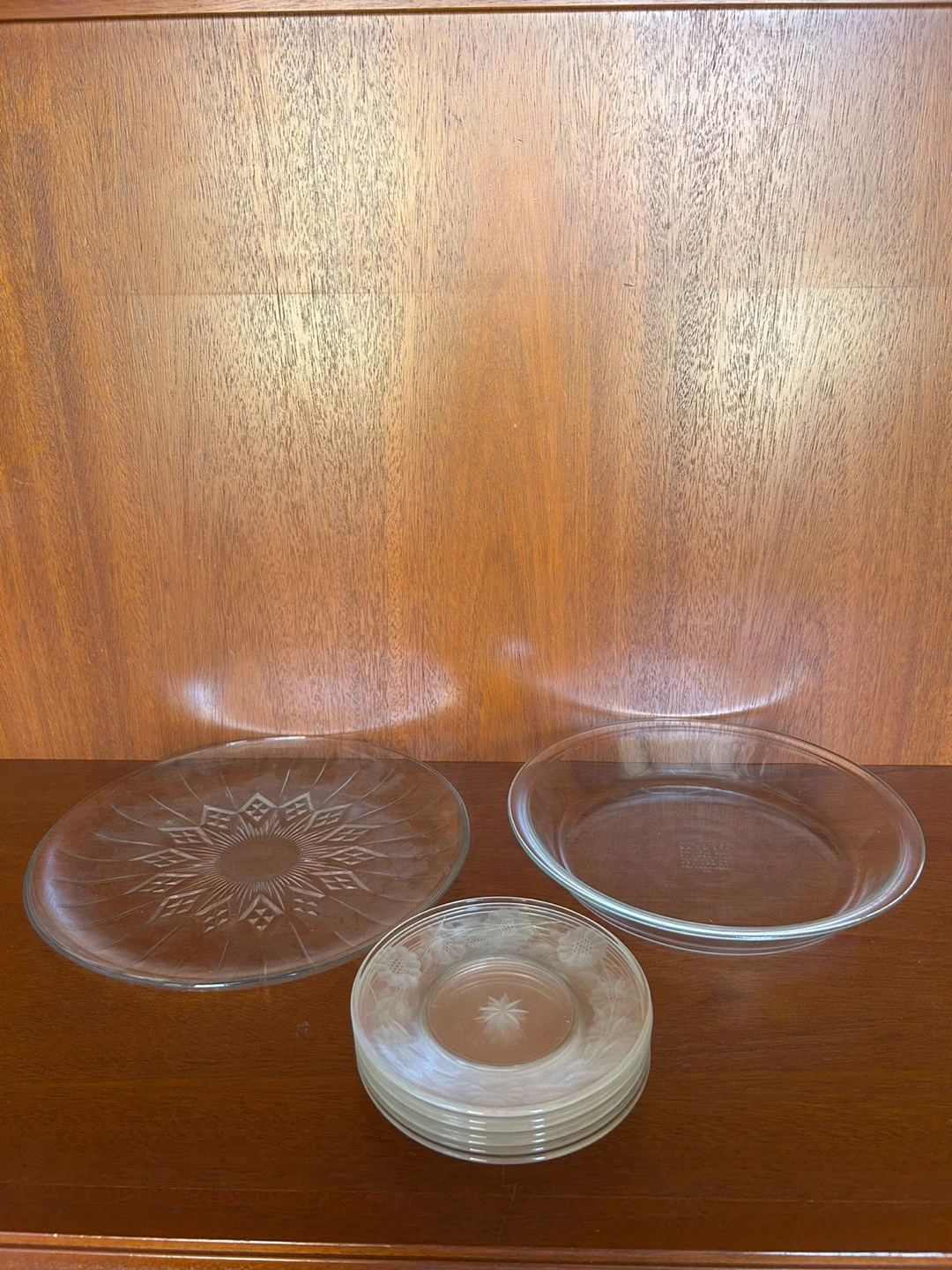 Selling a set of Pyrex glass plates. They are in great condition and perfect for oven and microwave use. They are also broiler safe. There is one large plate and several smaller plates.