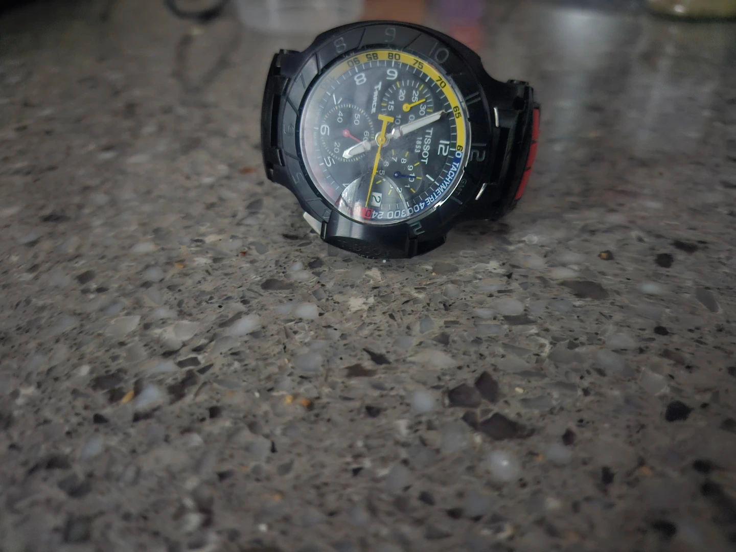 This Tissot chronograph watch features a tachymetre scale for measuring speed. It has a black dial with yellow accents and a durable case. Functions include timekeeping and stopwatch capabilities.