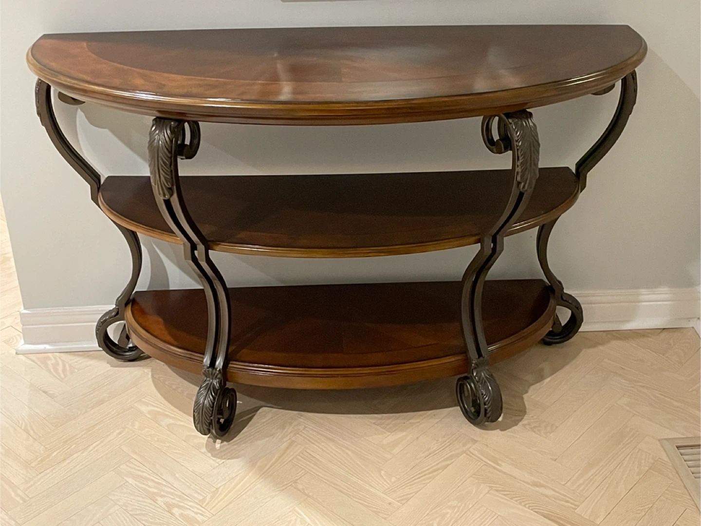 This decorative console table features a rich wood finish and a metal frame with ornate detailing. It has two additional shelves for storage or display. Its half-moon shape makes it ideal for entryways or hallways. For pick up in King City.