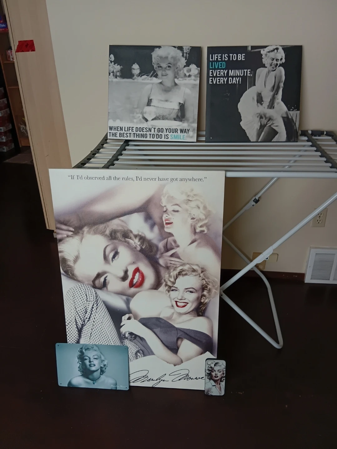 Collection of Marilyn Monroe prints and a small photo. Features iconic images and quotes. Great for fans of classic Hollywood!