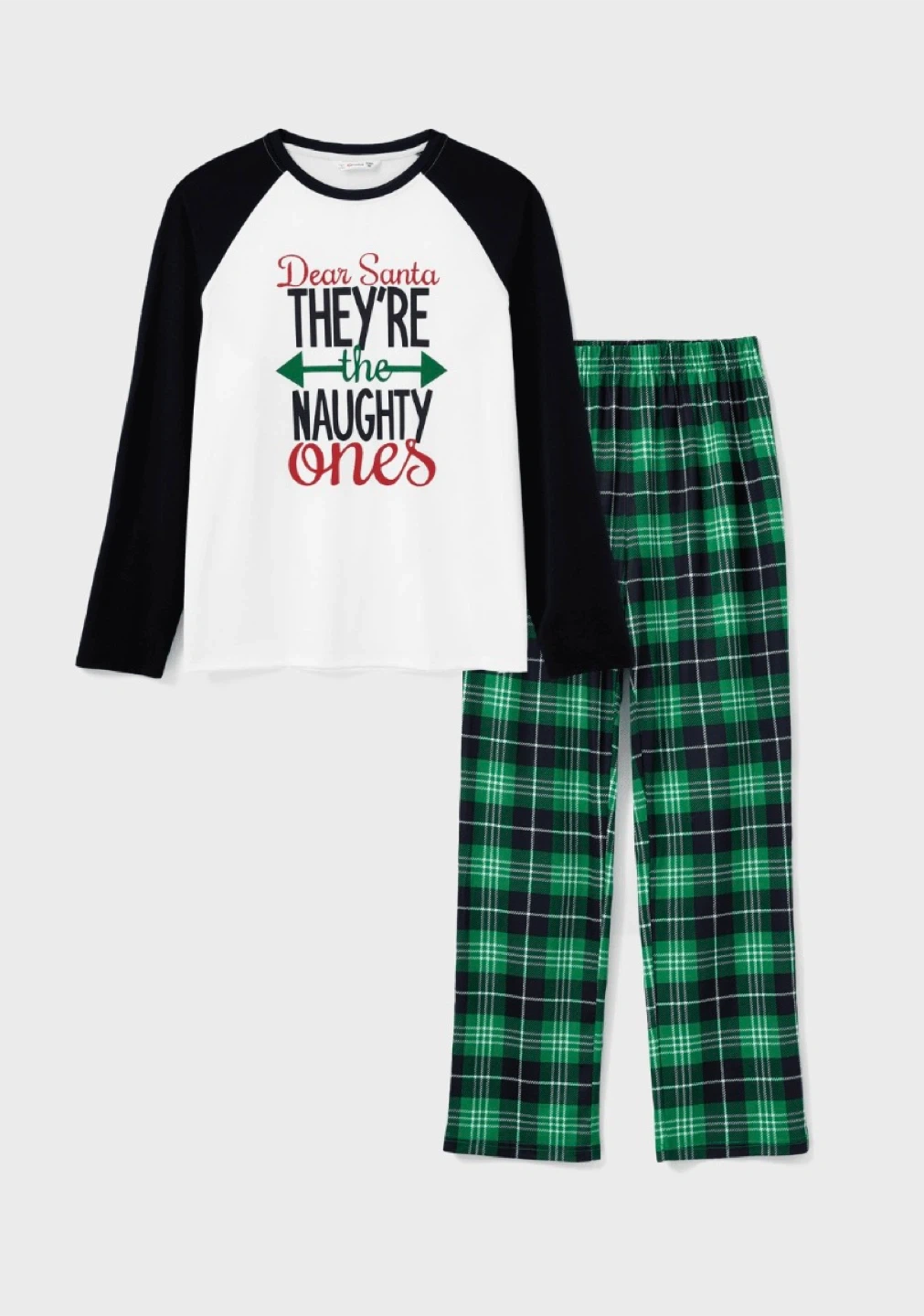 Brand New: unopened! Cozy long-sleeve raglan top with 'Dear Santa, They're the Naughty Ones' graphic and green plaid flannel pants. Perfect for family holiday photos or lounging around the house! Available in Women size M and Men size L.