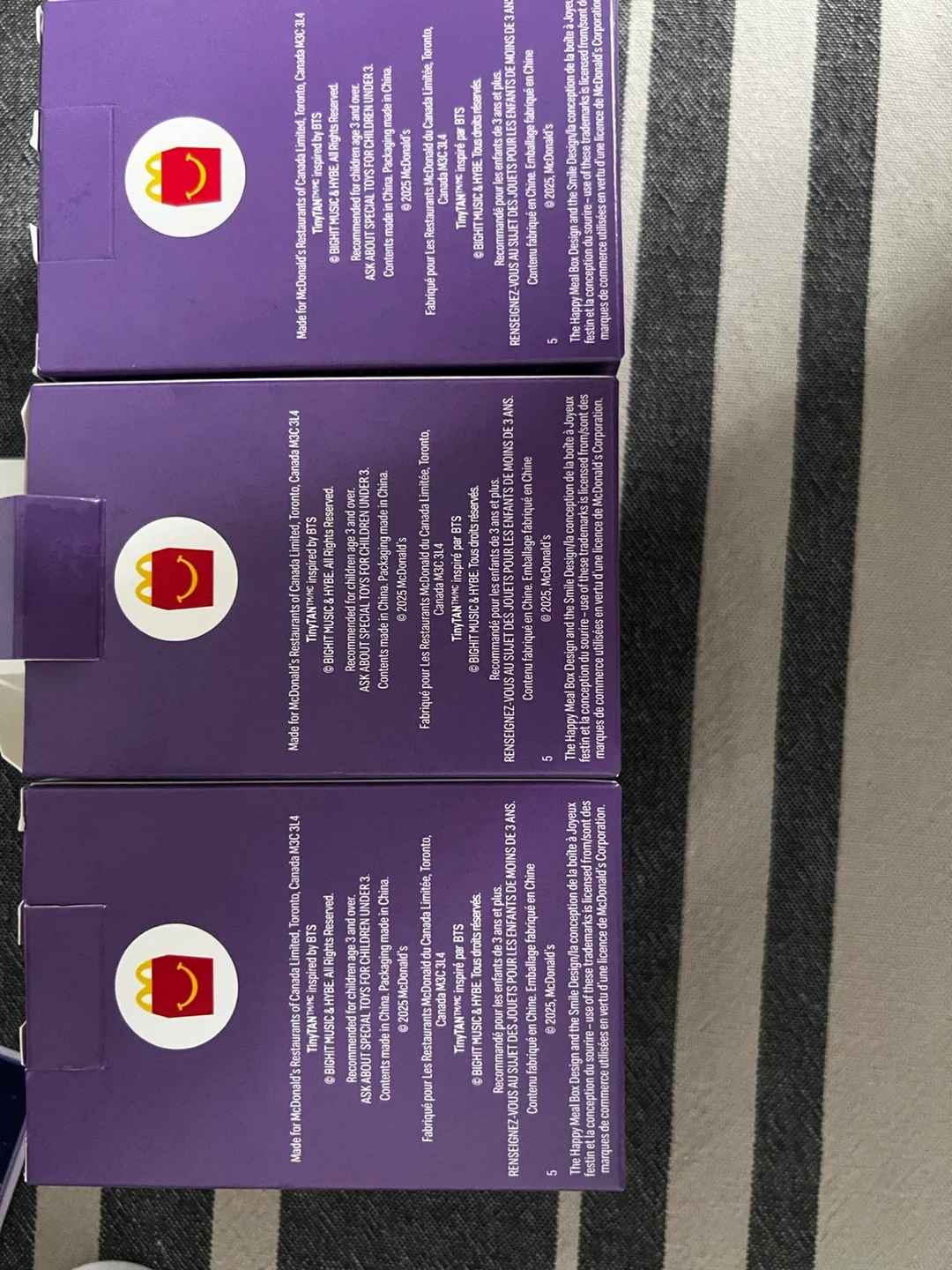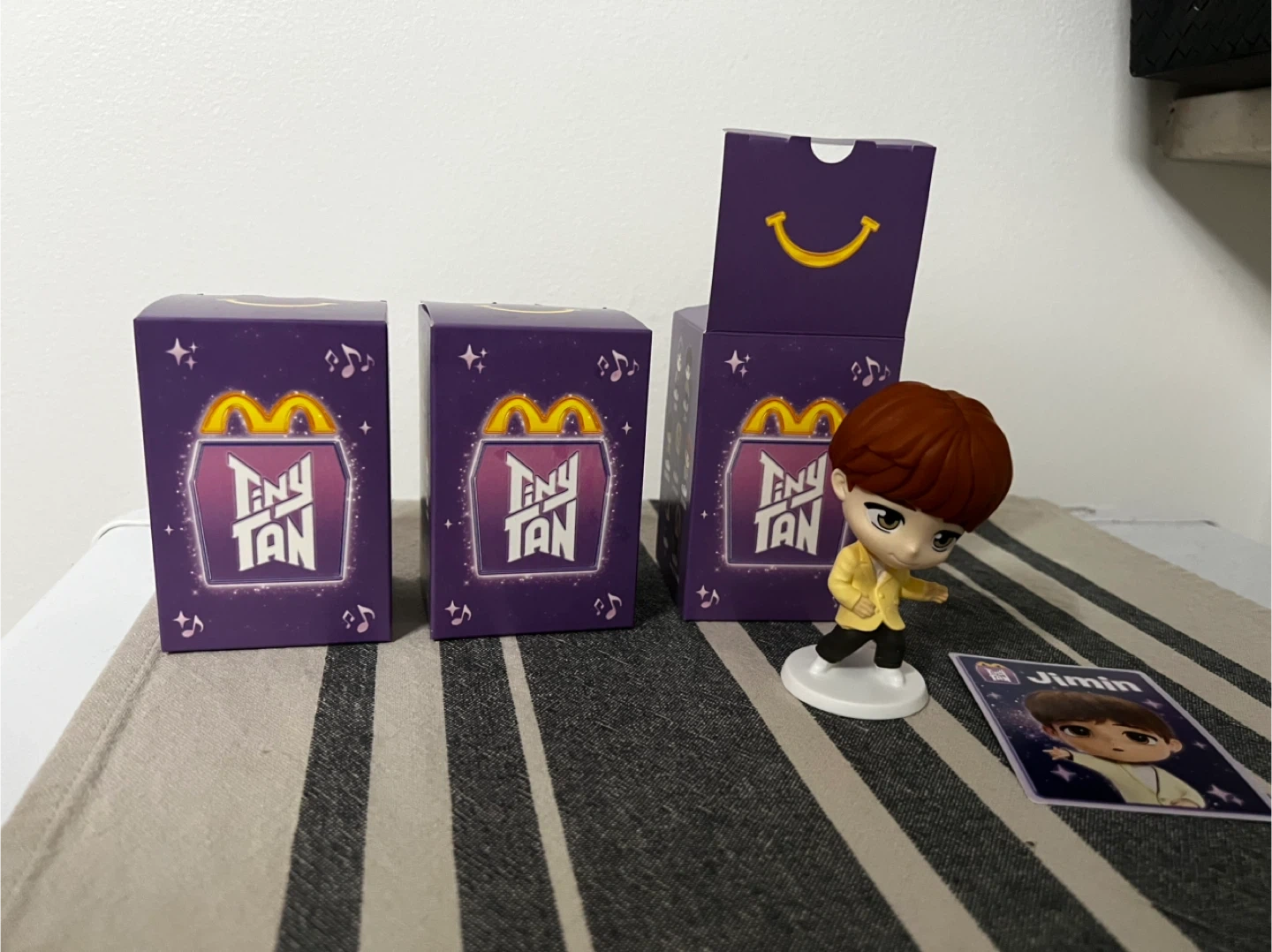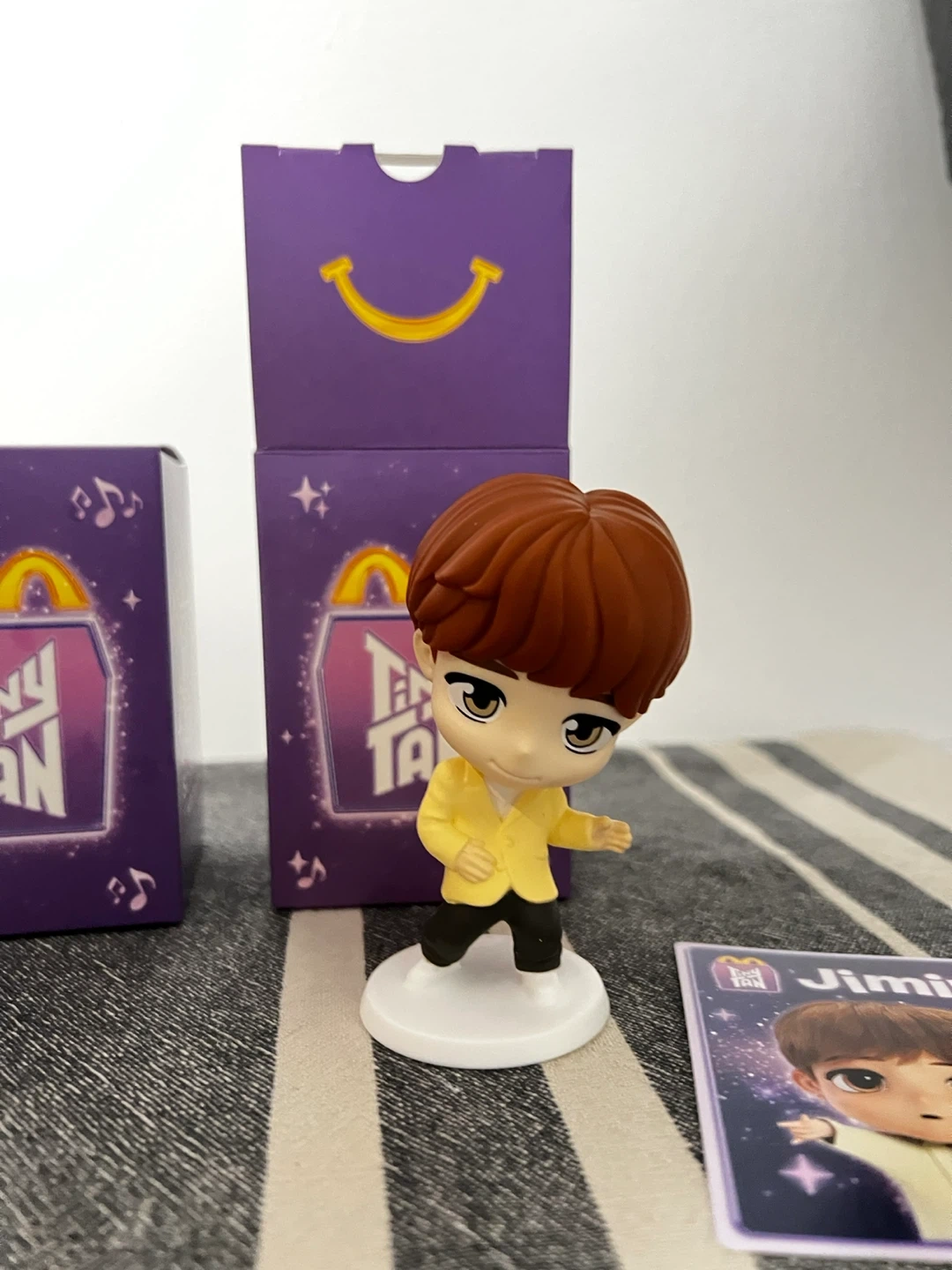 2/3 available Two TinyTan BTS Jimins from the McDonald's x Tinytan collaboration. ALL in original boxes and packaging with cards $6 each or $16 for all three. Only looking to trade for: Encore Edition - RM, Suga, or Jungkook No stains or damage Meet at Landsdowne Area. **Cash only**