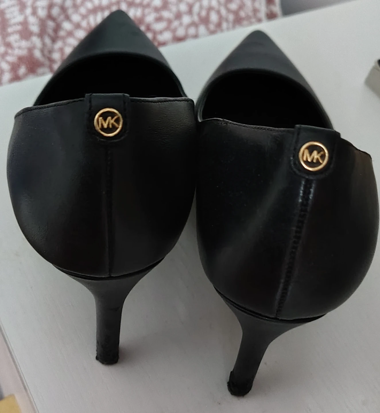 Classic black leather pumps from Michael Kors. Features a stylish pointed toe and a comfortable heel height. These shoes are made from genuine leather and have the MK logo detail on the heel.