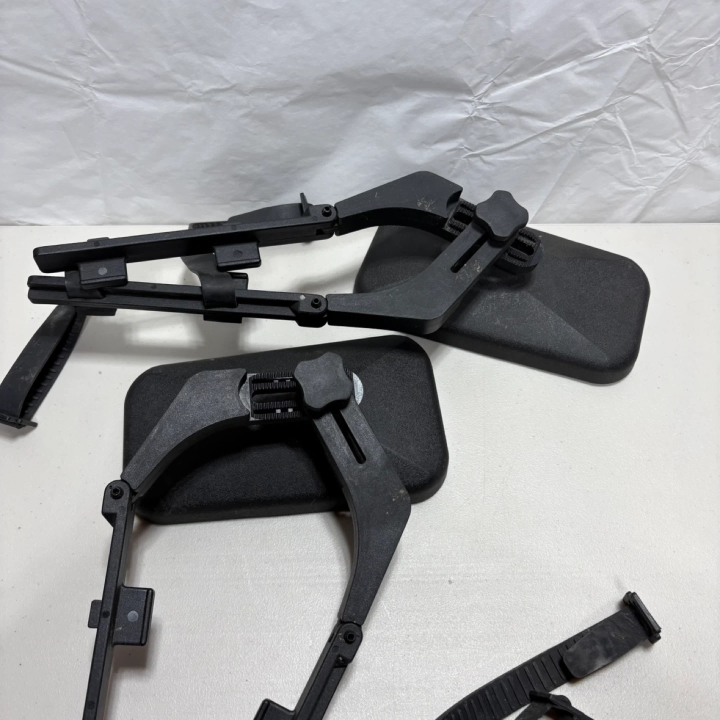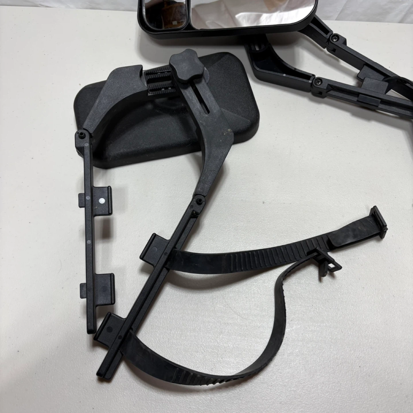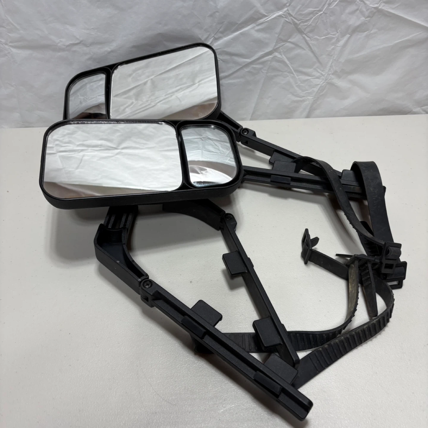 These are towing mirrors designed for vehicles. They are black with adjustable straps for mounting. The dual mirror design provides a wider view.
