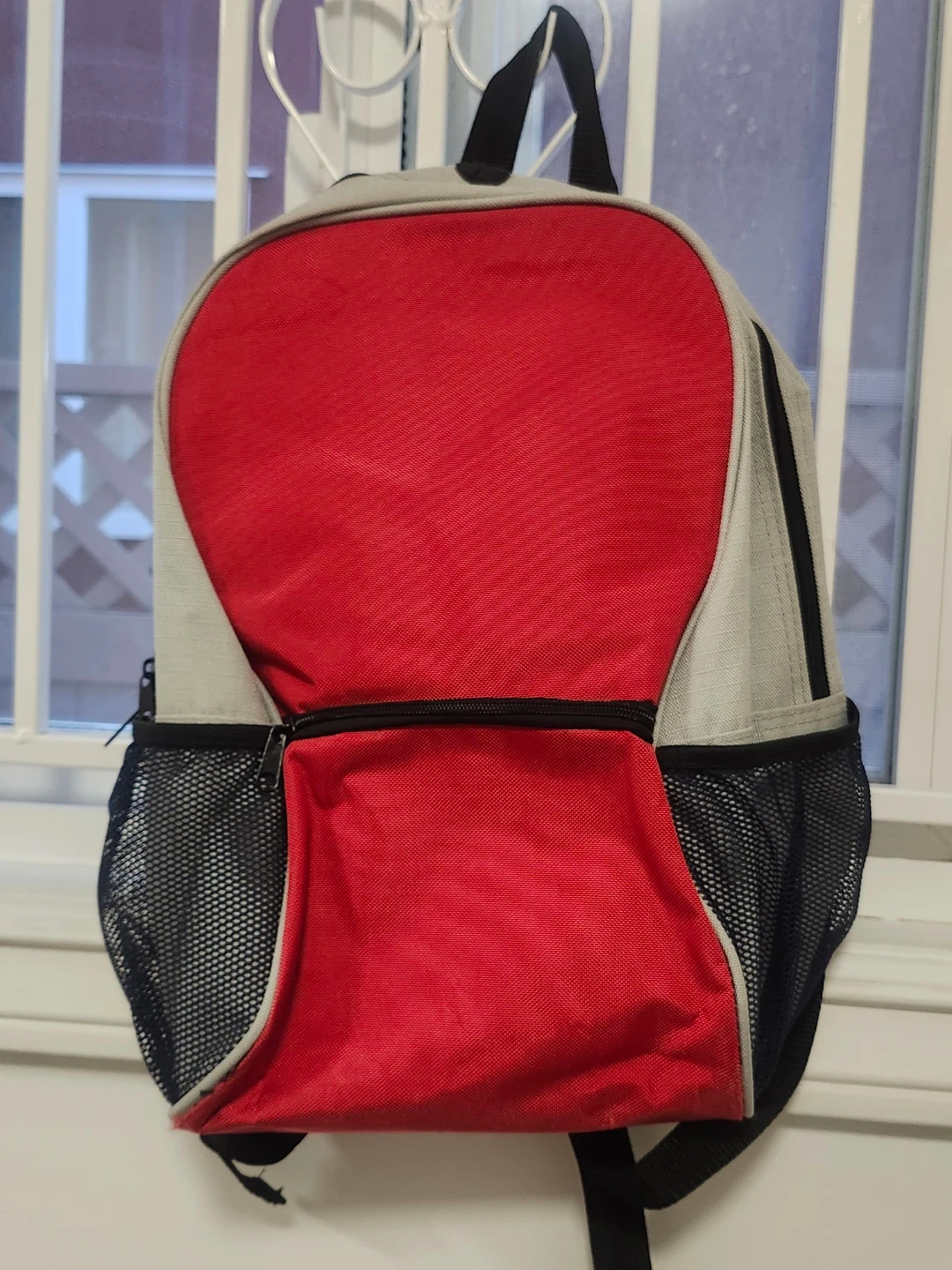 This is a red and grey backpack with a zippered front pocket and mesh side pockets. It's great for carrying everyday essentials! The bag features adjustable shoulder straps for comfort.