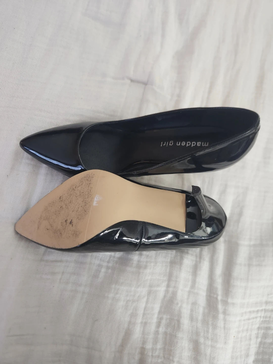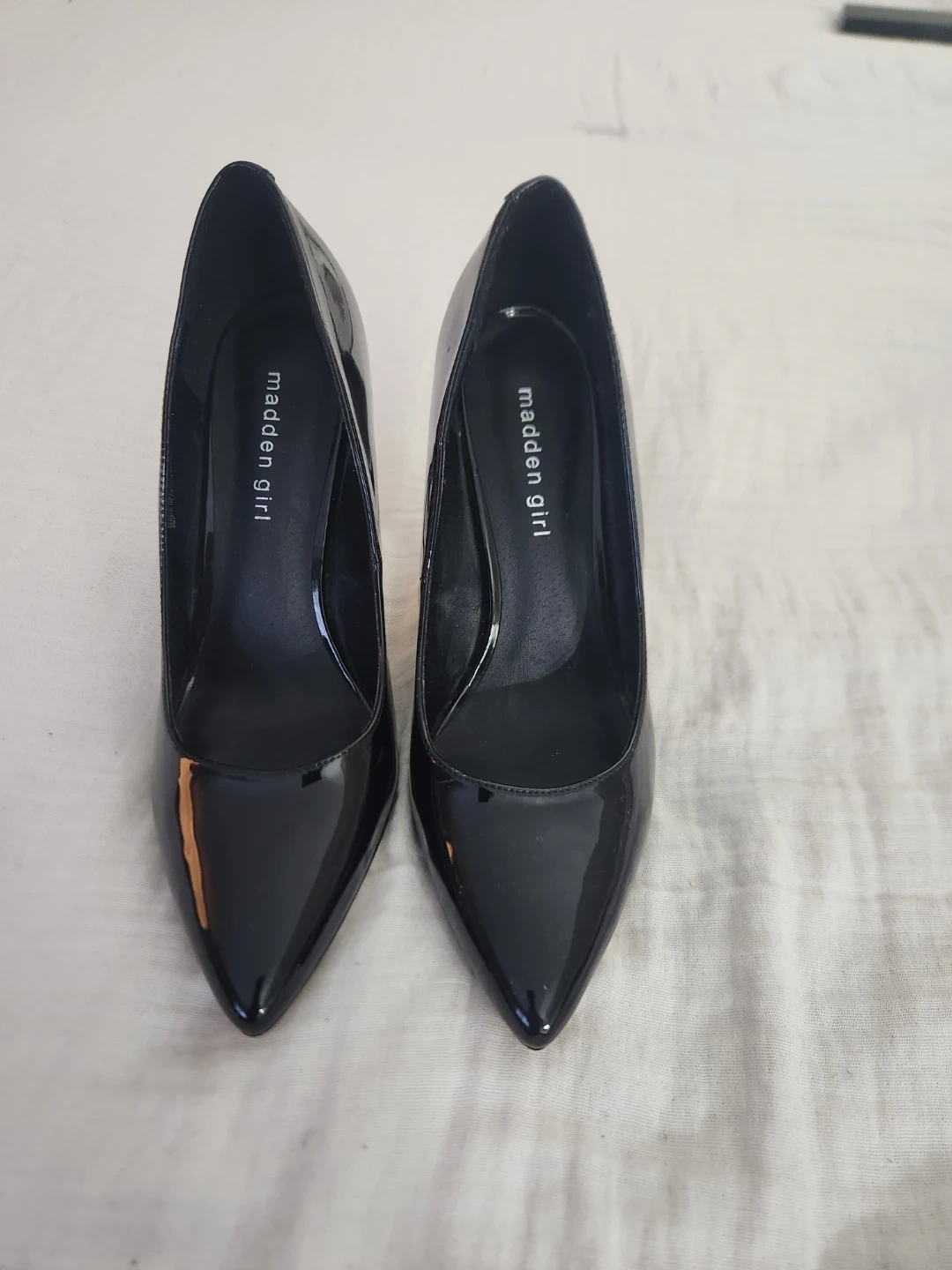 These Madden Girl heels have a shiny black patent finish. They're classic stilettos with a pointed toe and a high heel. Perfect for dressing up any outfit!