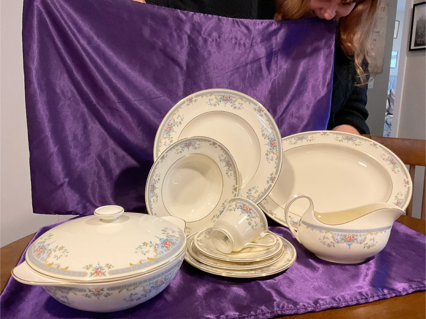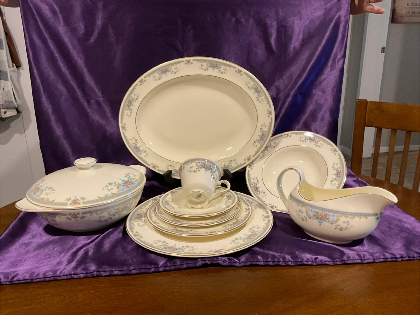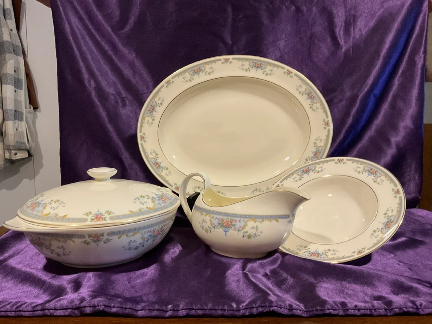 This Royal Doulton, 10 place setting plus gravy boat, platter, covered serving dish, china set features a delicate floral pattern with blue and pink accents and a gold trim. It includes dinner plates, salad plates, bowls, a cup and saucer, a serving platter, a covered casserole dish, and a gravy boat. It's perfect for elegant dining or special occasions!