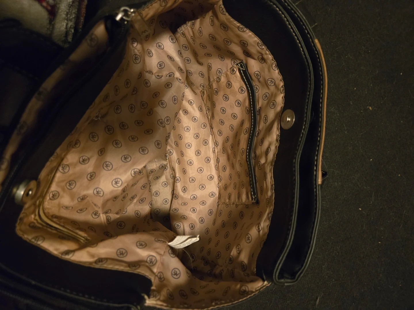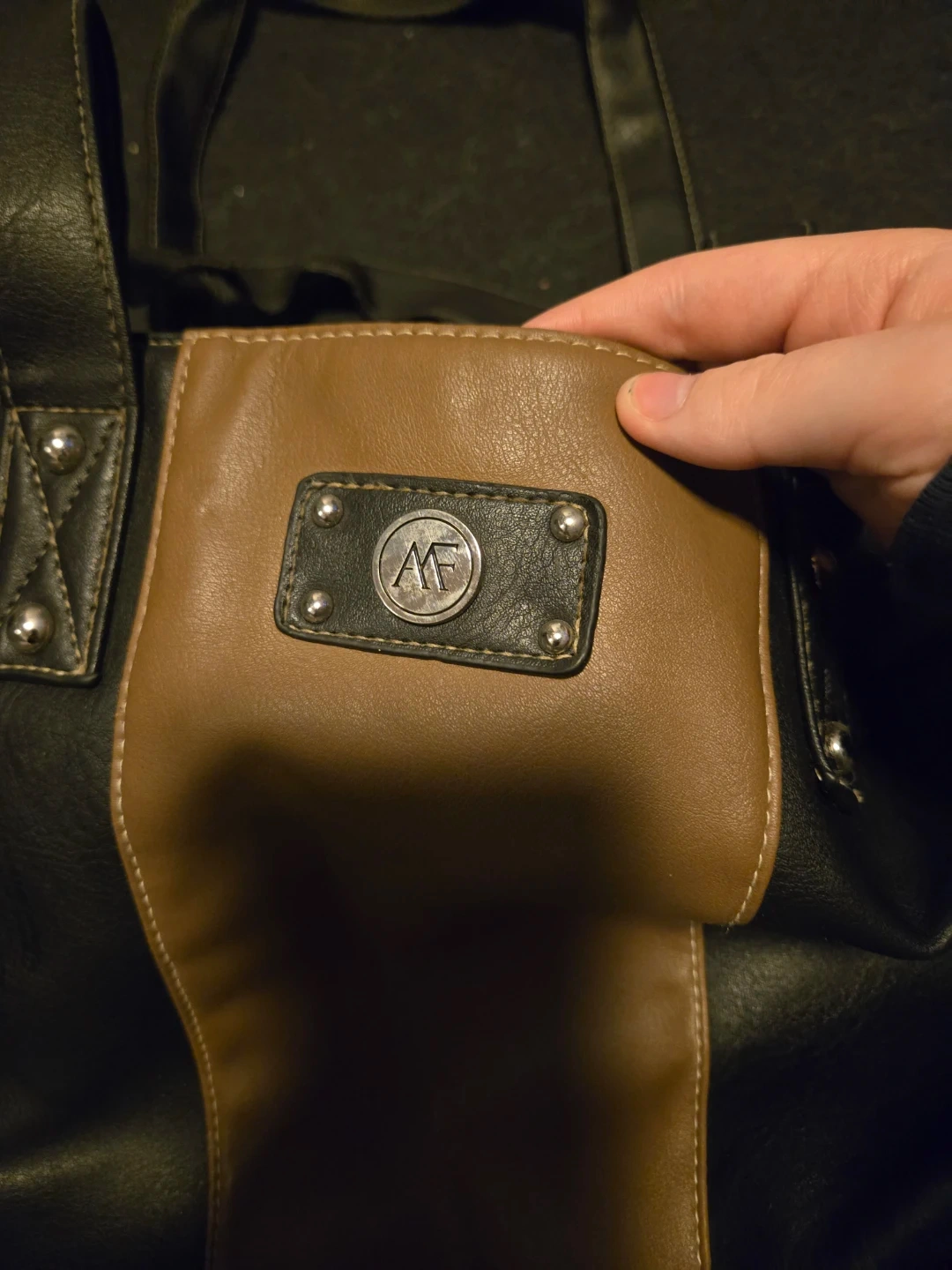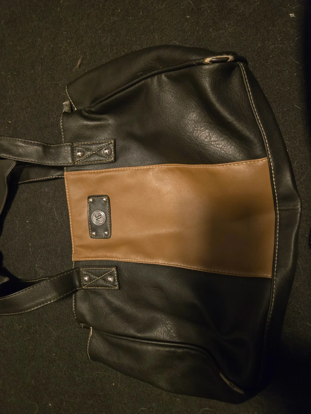 This AF tote bag has a black faux leather exterior with a tan accent panel. It's lined with patterned fabric and features an interior zippered pocket. A great everyday purse! Slightly damaged