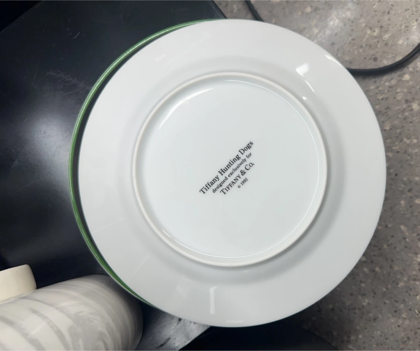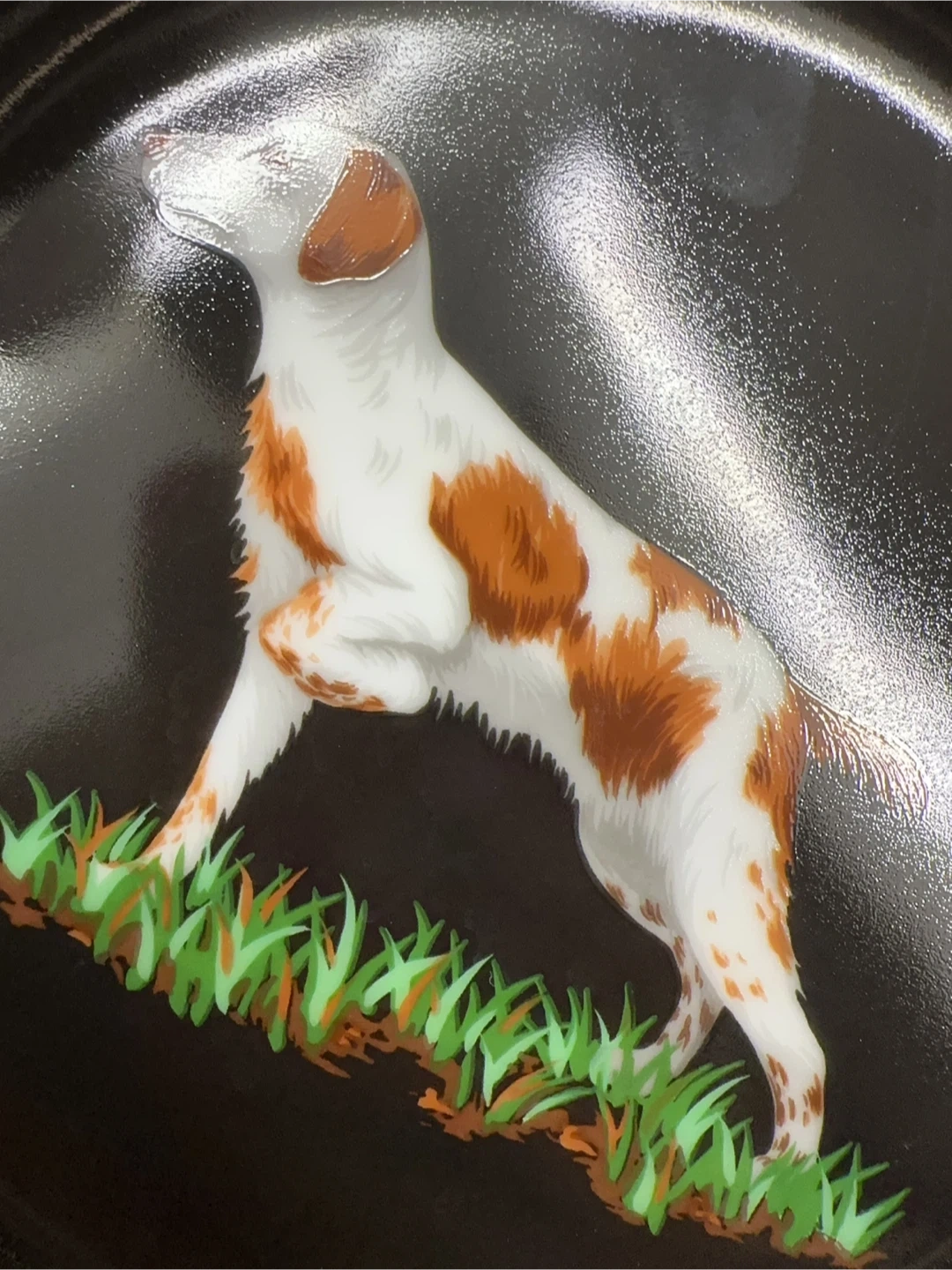 This set of four, decorative, porcelain plates were designed exclusively by Tiffany & Co. in 1992, as a set entitled “Hunting Dogs.” Each plate is 7 3/4″ in diameter, and it is a high gloss black with a bright kelly green rim. A Springer Spaniel, a German Short-Haired Pointer, an English Setter, and a Brittany Spaniel are each represented. Each dog is beautifully and artistically detailed, and each dog is done in a similar color palette. Two of the dogs face to the right and two face to the left. All these things combined make this set of porcelain plates perfect to be displayed together. The set is in mint condition.
