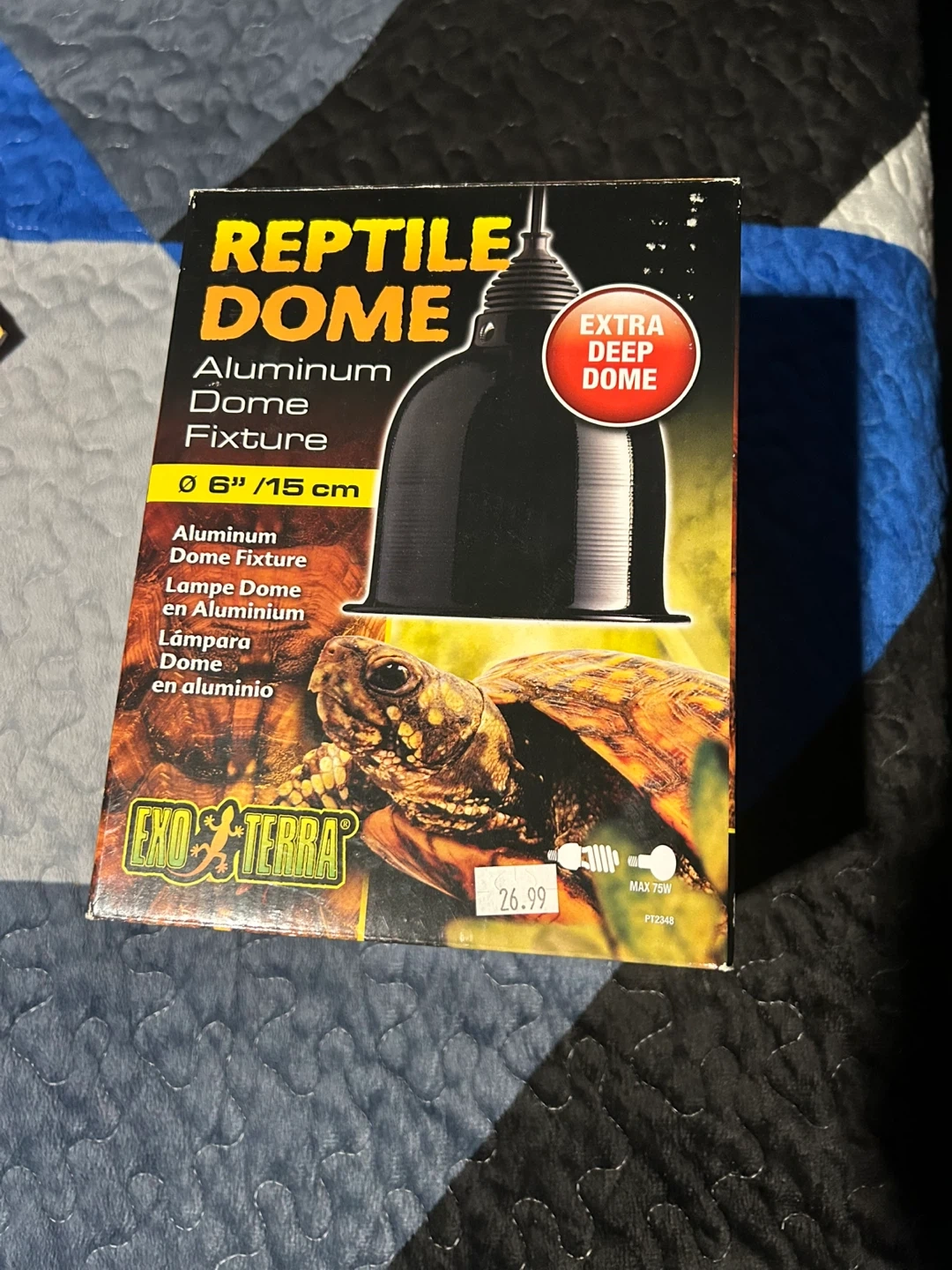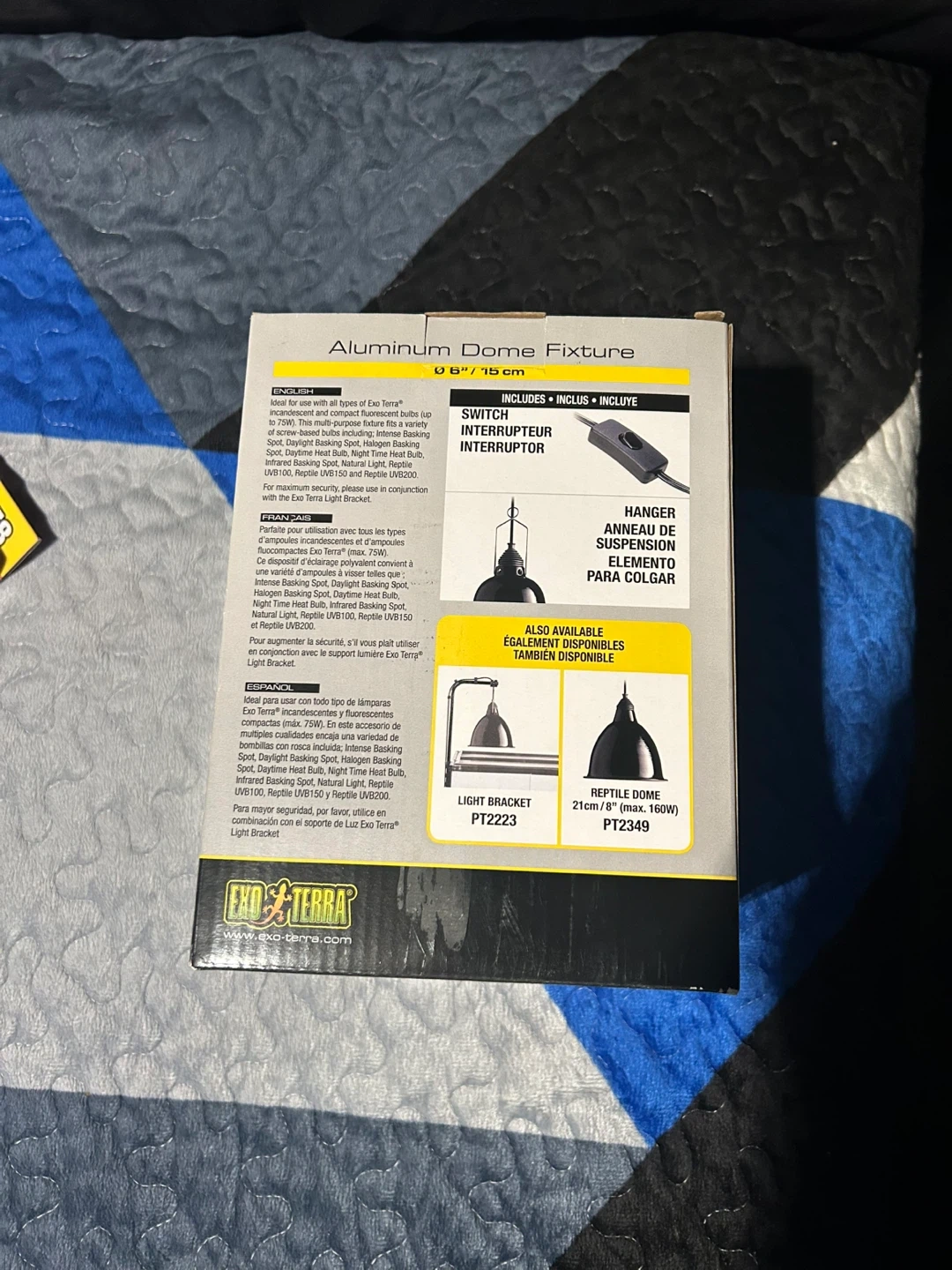 This is an Exo Terra Aluminum Dome Fixture. It's 6 inches or 15 cm in size. It includes a hanger and suspension element.