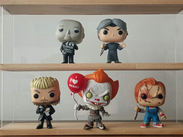 Includes FREE display case and the following Funko POP figurines: Pennywise with balloon (IT 2017), Scarred Chucky (Bride of Chucky), Alfred Hitchcock (Psycho 1960), Norman Bates (Psycho 1960), and David with Noodles (The Lost Boys). Cash only, please bring exact change. Local pickup only.