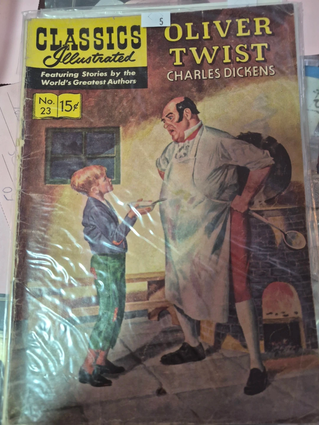 This is Classics Illustrated comic book number 23, featuring Oliver Twist by Charles Dickens. It showcases stories by the World's Greatest Authors. This comic is a great addition for any collector!