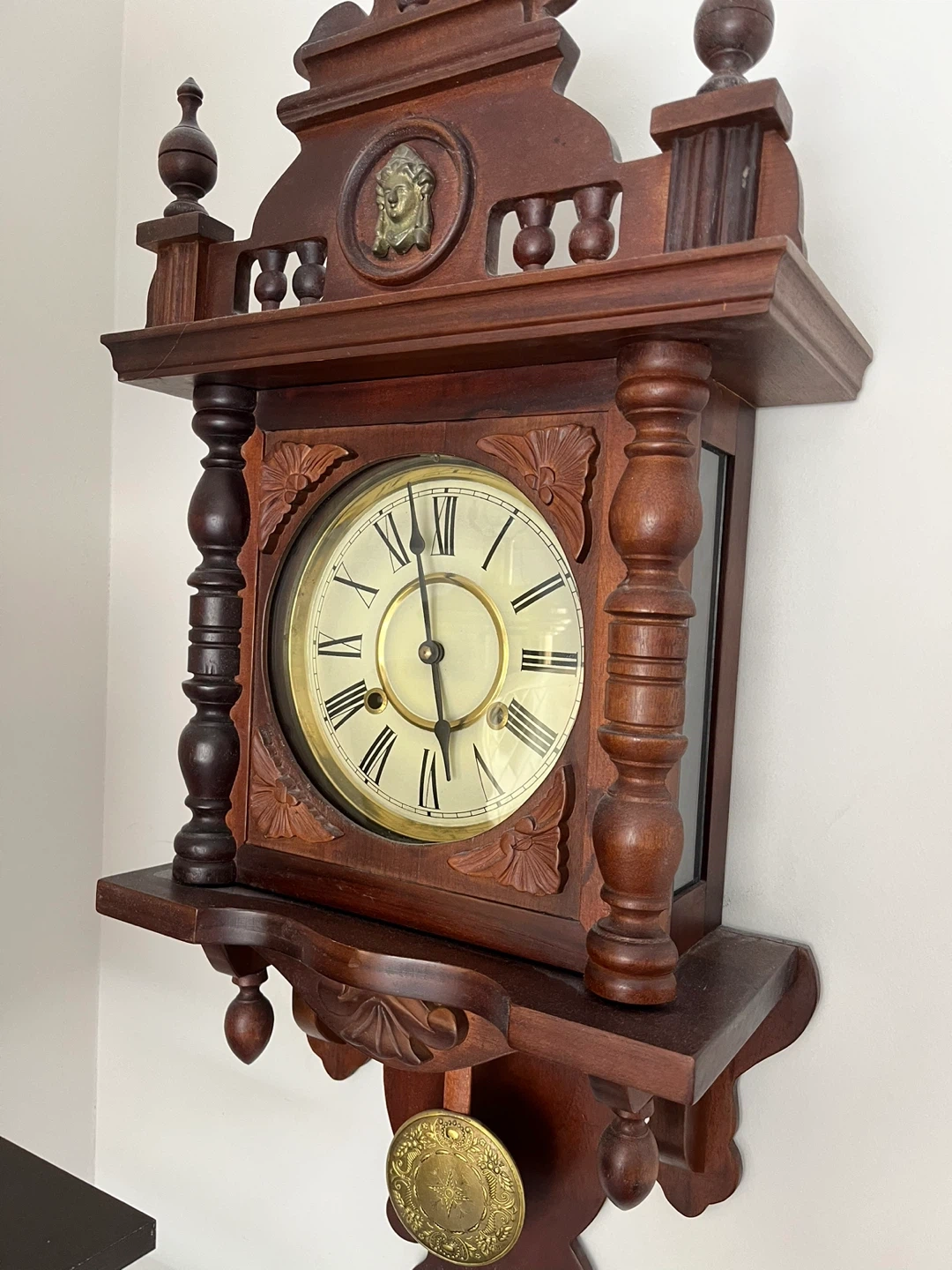 This decorative clock is crafted from dark wood. It features a circular face with Roman numerals and intricate carvings. The pendulum adds a classic touch.