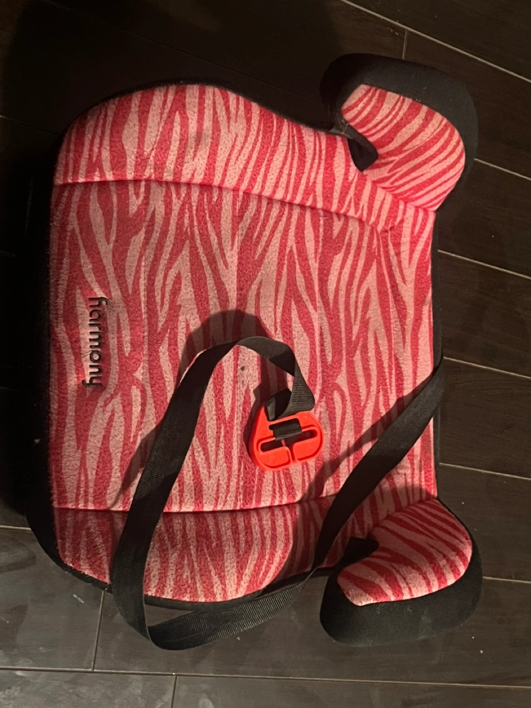 Harmony booster car seat in a fun pink zebra print. This car seat provides a comfortable and safe ride for your little one. It's designed for easy installation and use.