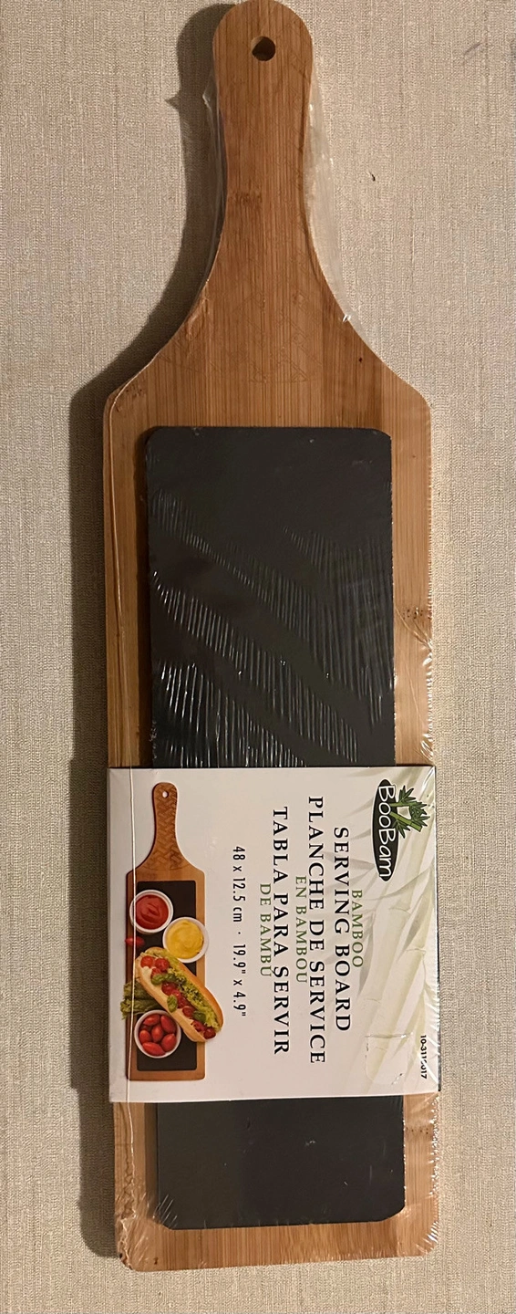 Bamboo and slate serving board. New in packaging. Size: 19.9” x 4.9”. Evening and weekend pickup only. Closest major intersection is Hurontario Street and Central Parkway in Mississauga.