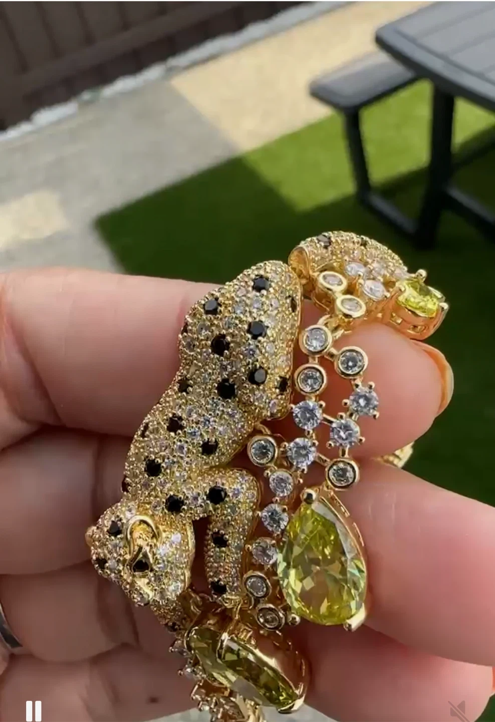 Selling a unique gold-tone bracelet featuring a leopard design adorned with black spots and clear gemstones. It also has a variety of coloured gemstones, including red and green, adding a vibrant touch to the piece