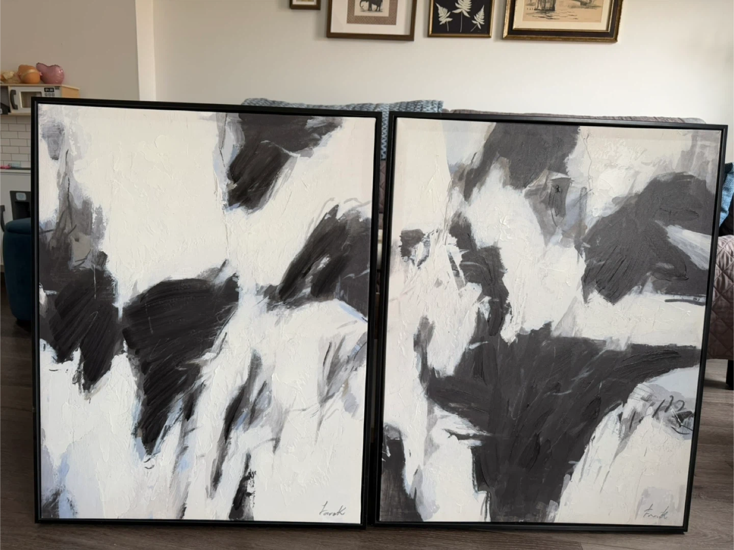 Two abstract paintings in black, white, and grey tones. Each piece is framed in black. These would add a modern touch to any room!