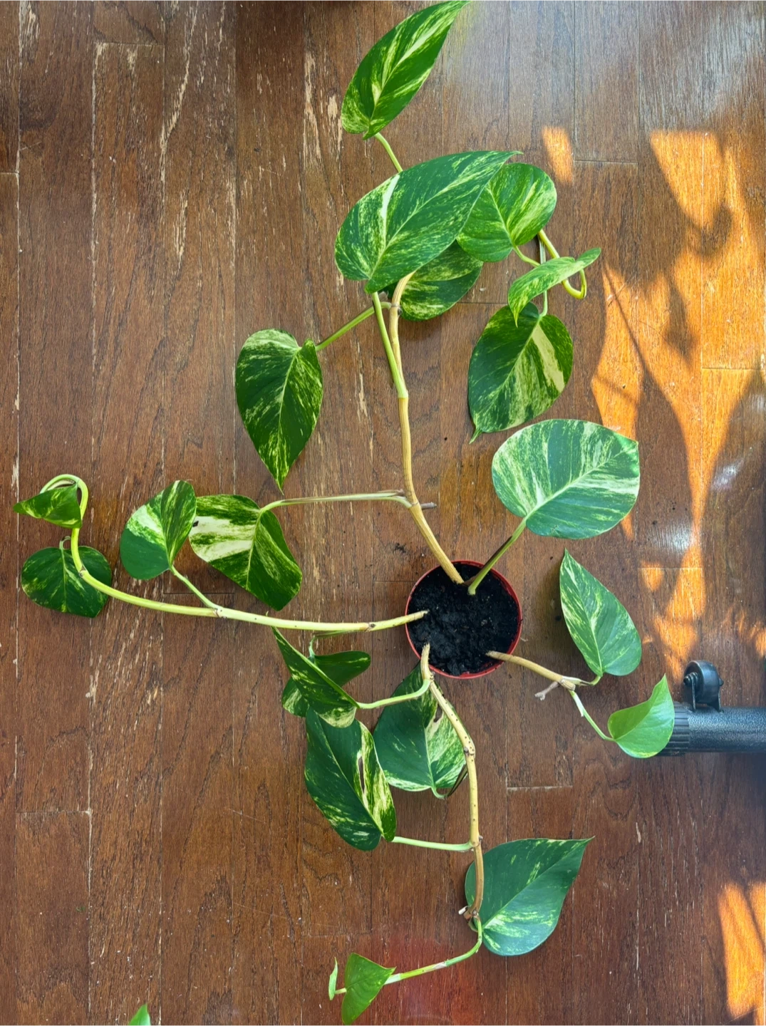 A healthy variegated pothos plant in a red pot. Its vines are long and trailing, perfect for hanging baskets or shelves. It's known for its easy-care nature and air-purifying qualities.