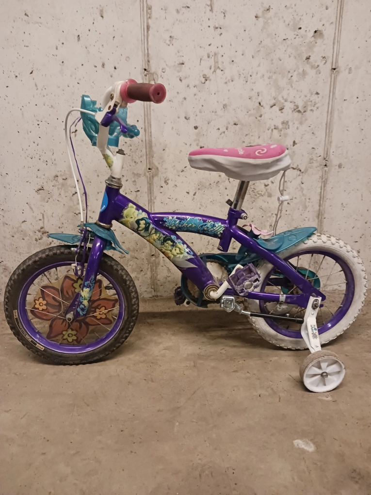 Giving away a cute Disney themed (Tinker Bell) kids' bike! It features a purple and teal colour scheme graphics. Perfect for a little one learning to ride. 13 inch wheels. Training wheels included.
