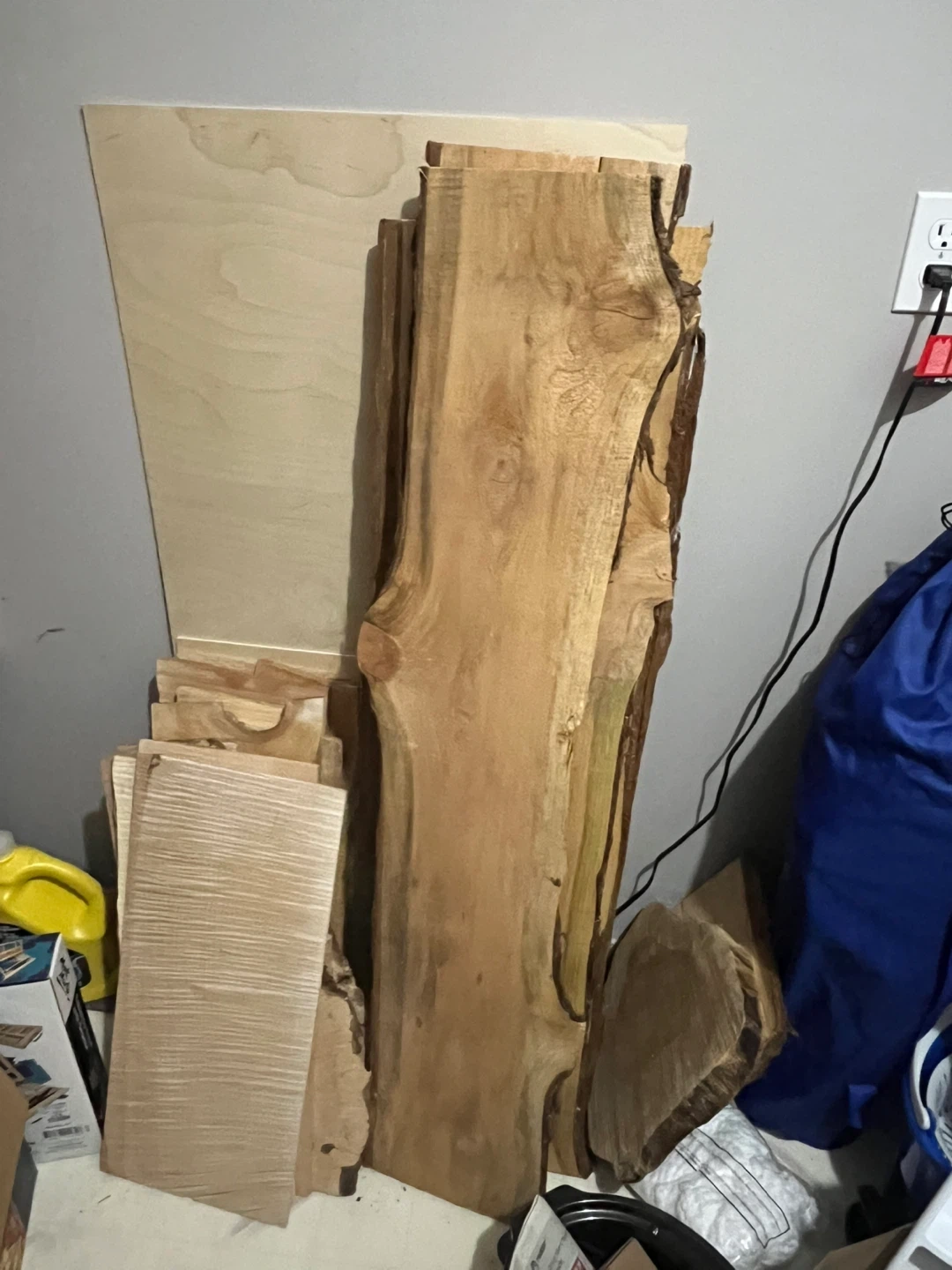 Assorted live edge wood slabs for woodworking projects. Various sizes and natural wood grain patterns. Wood type not specified.