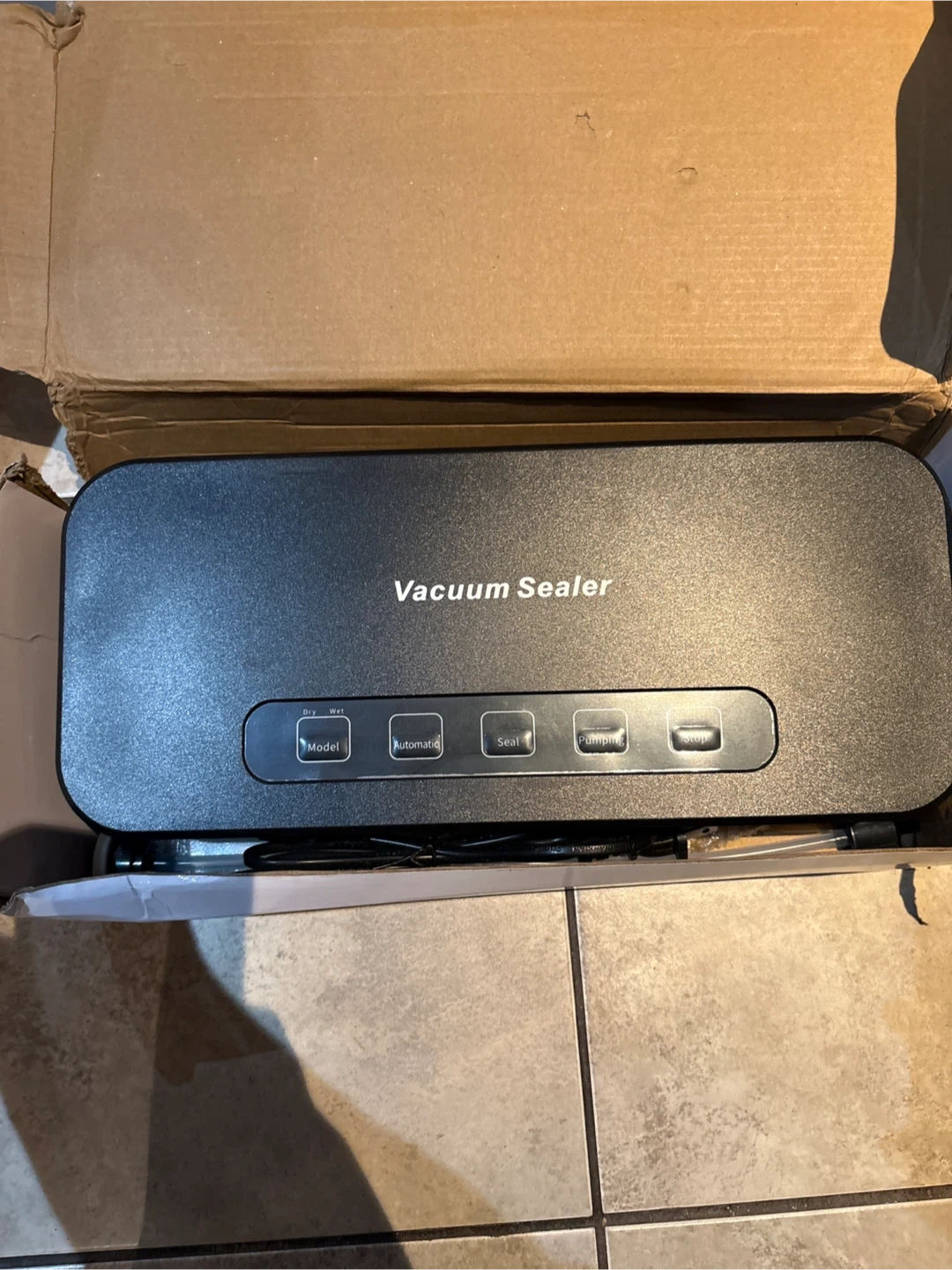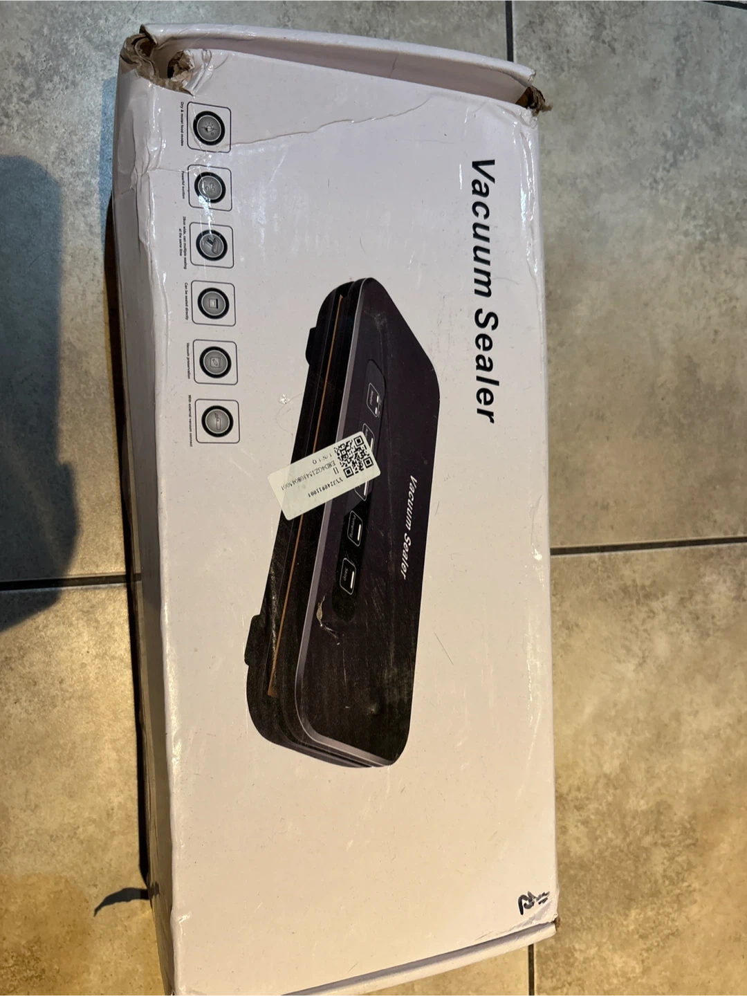 Vacuum sealer machine with included bag rolls. Unit is black and comes in original packaging. This device is for keeping food fresh by removing air and sealing it tightly.