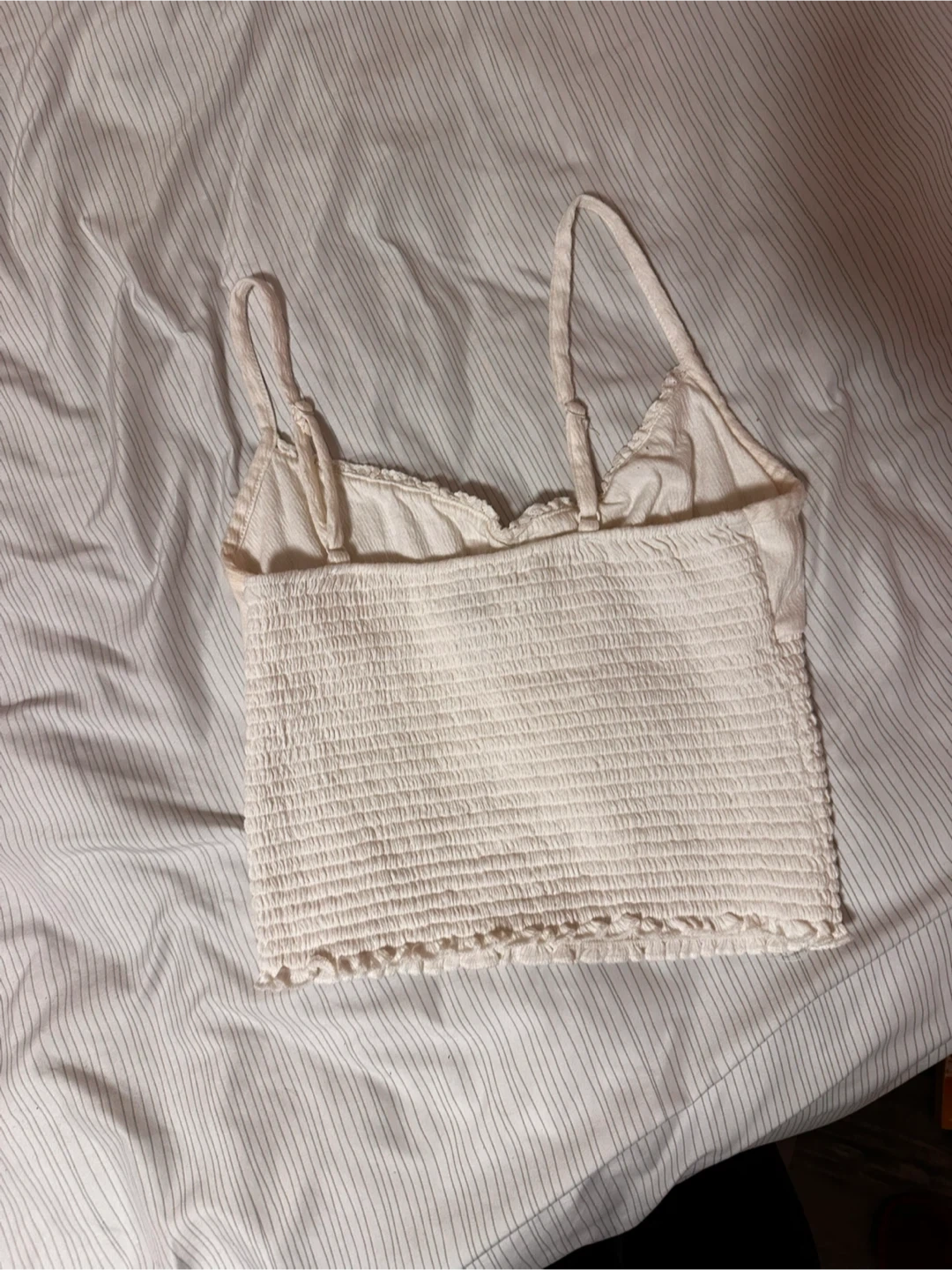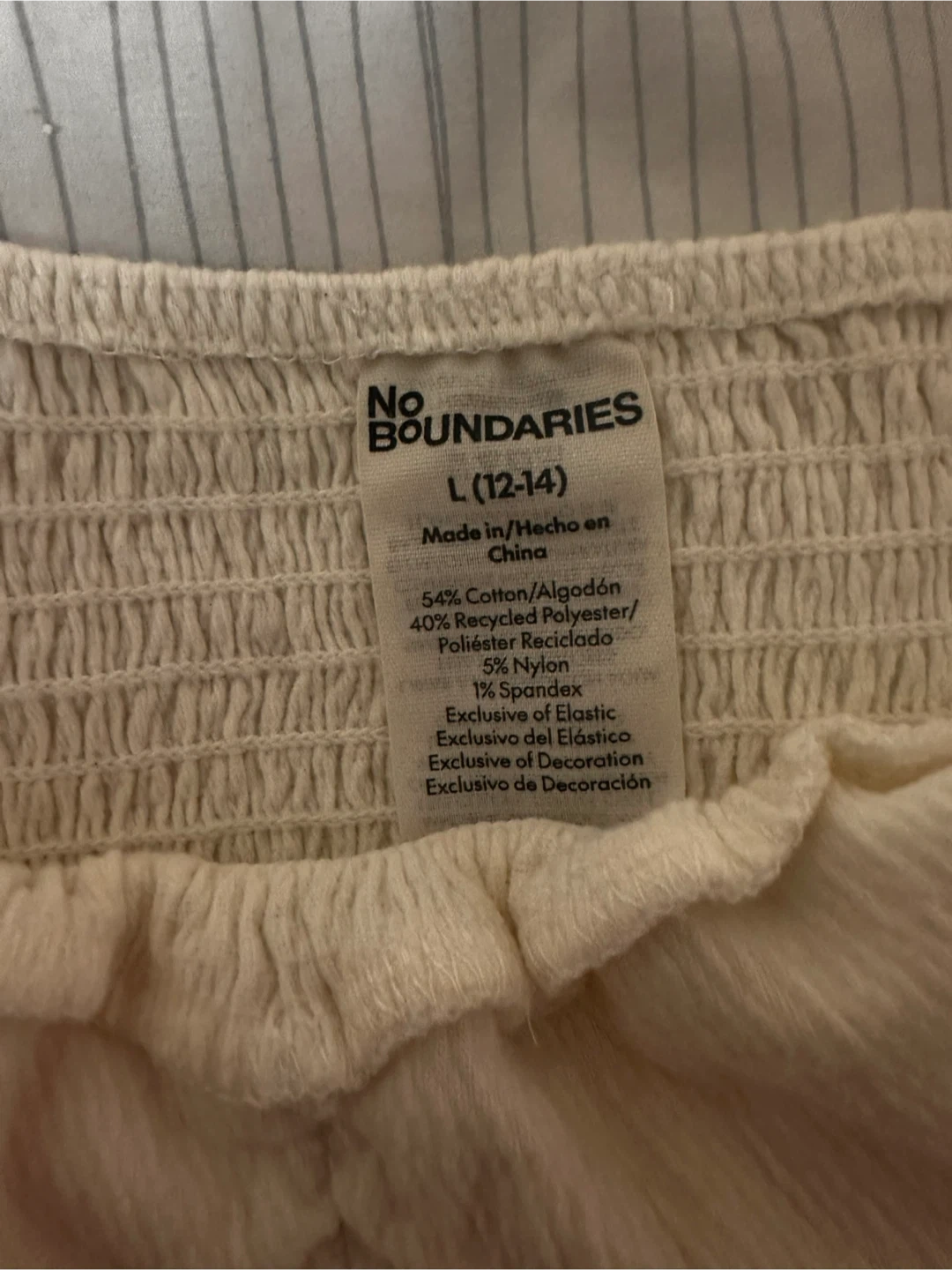 This cream No Boundaries smocked cami top is a size Large (12-14). It's made from 54% cotton, 40% recycled polyester, 5% nylon, and 1% spandex. This top is perfect for warm weather days!