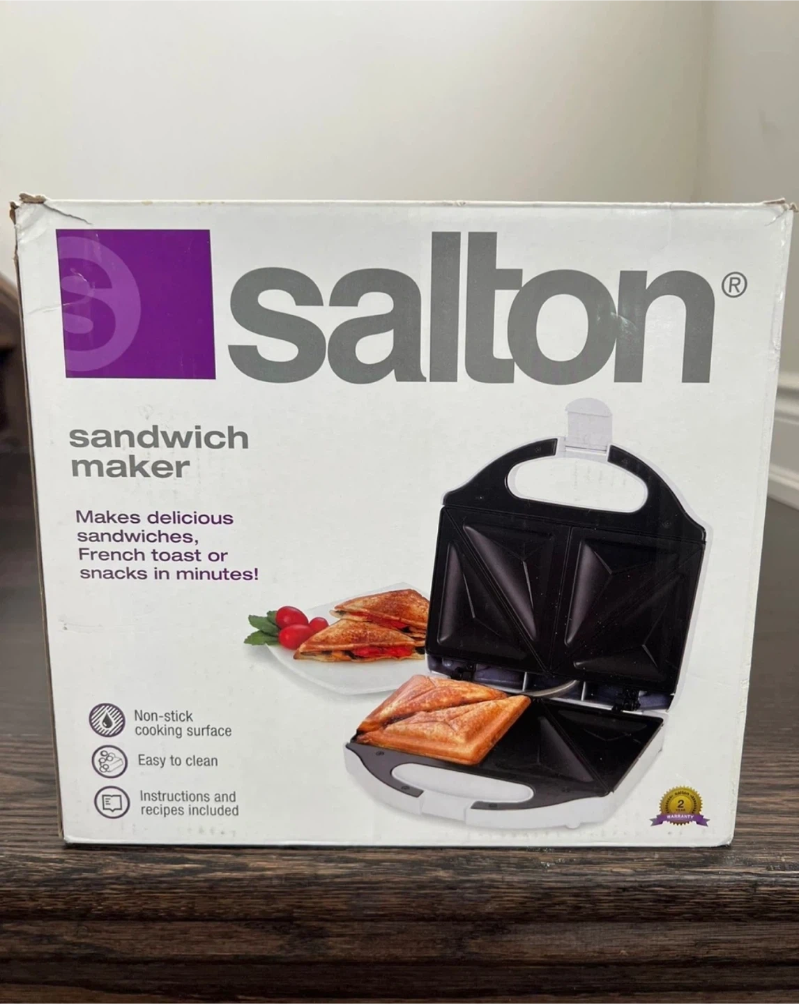 This Salton sandwich maker features a non-stick cooking surface and is easy to clean. Instructions and recipes are included. It makes delicious sandwiches, French toast, or snacks in minutes! Only message me if you are interested only serious inquiries about it thank you so much if you want to get it delivered then their will be charges for the delivery depending on the location recoding that thank you so much