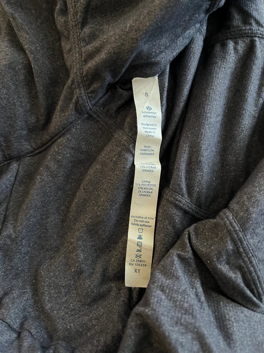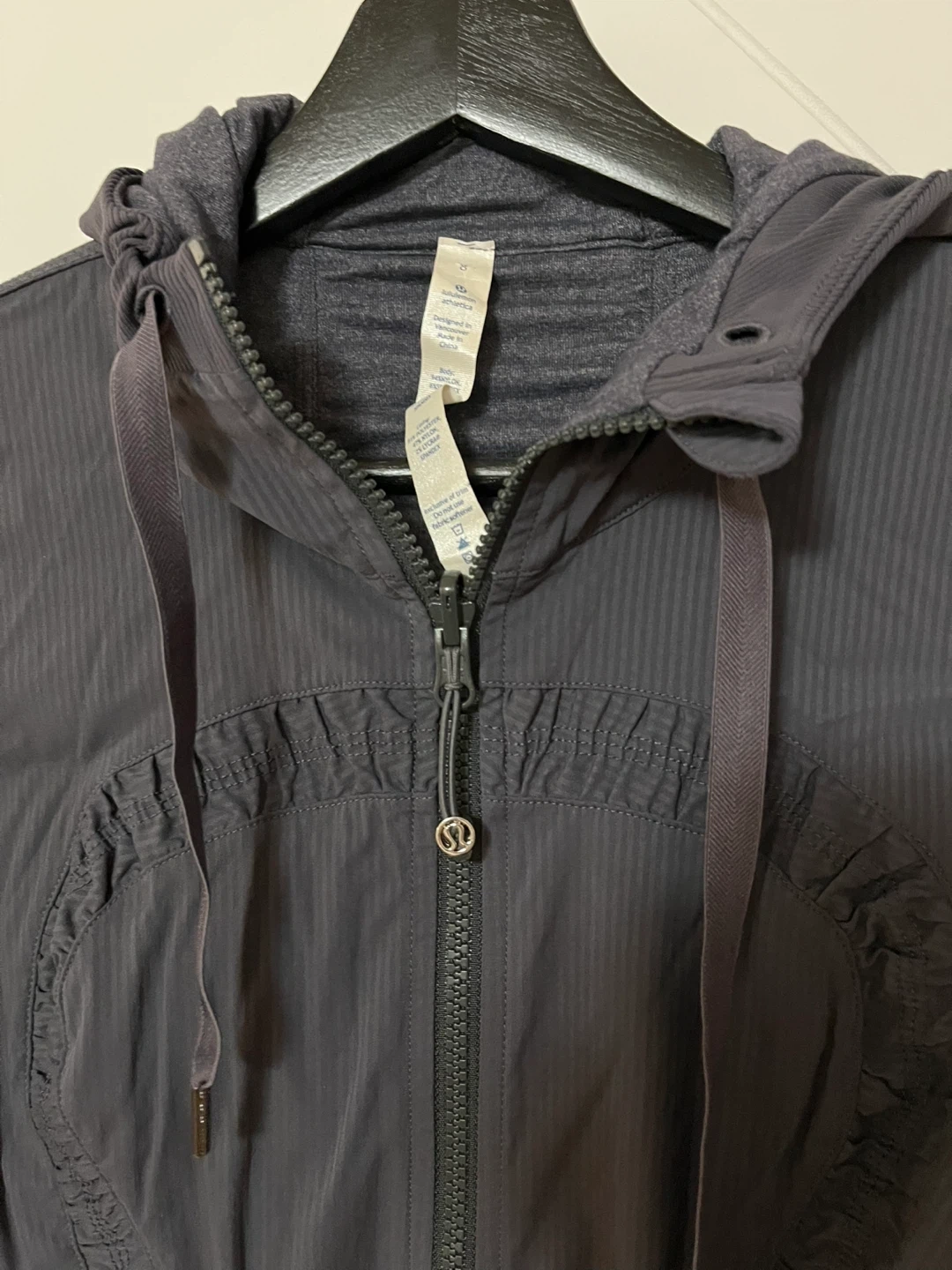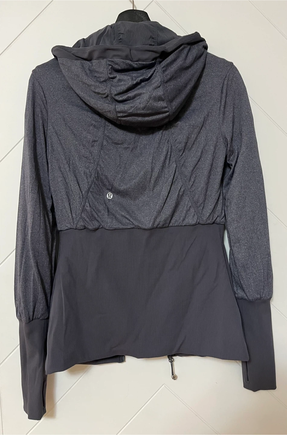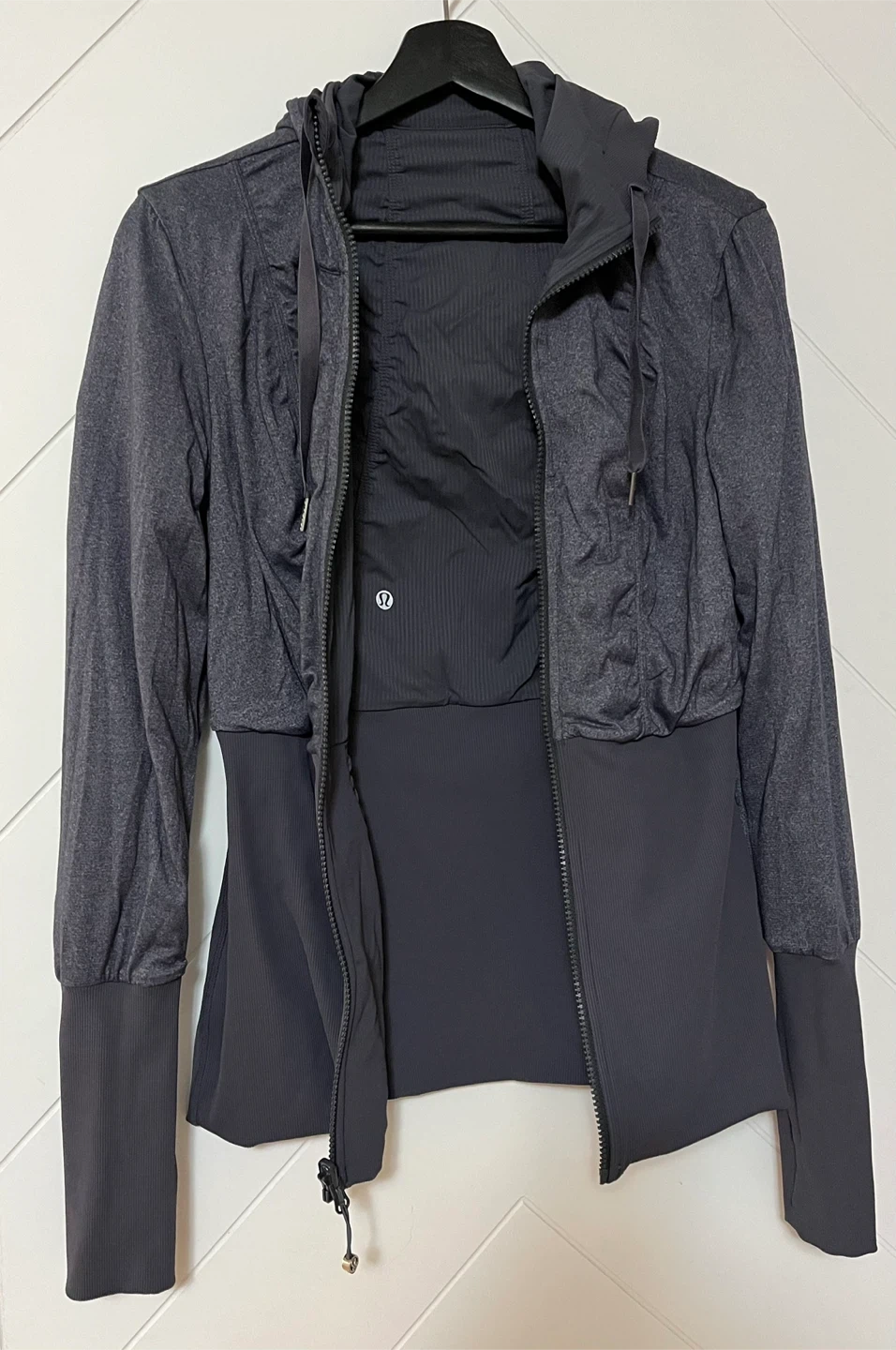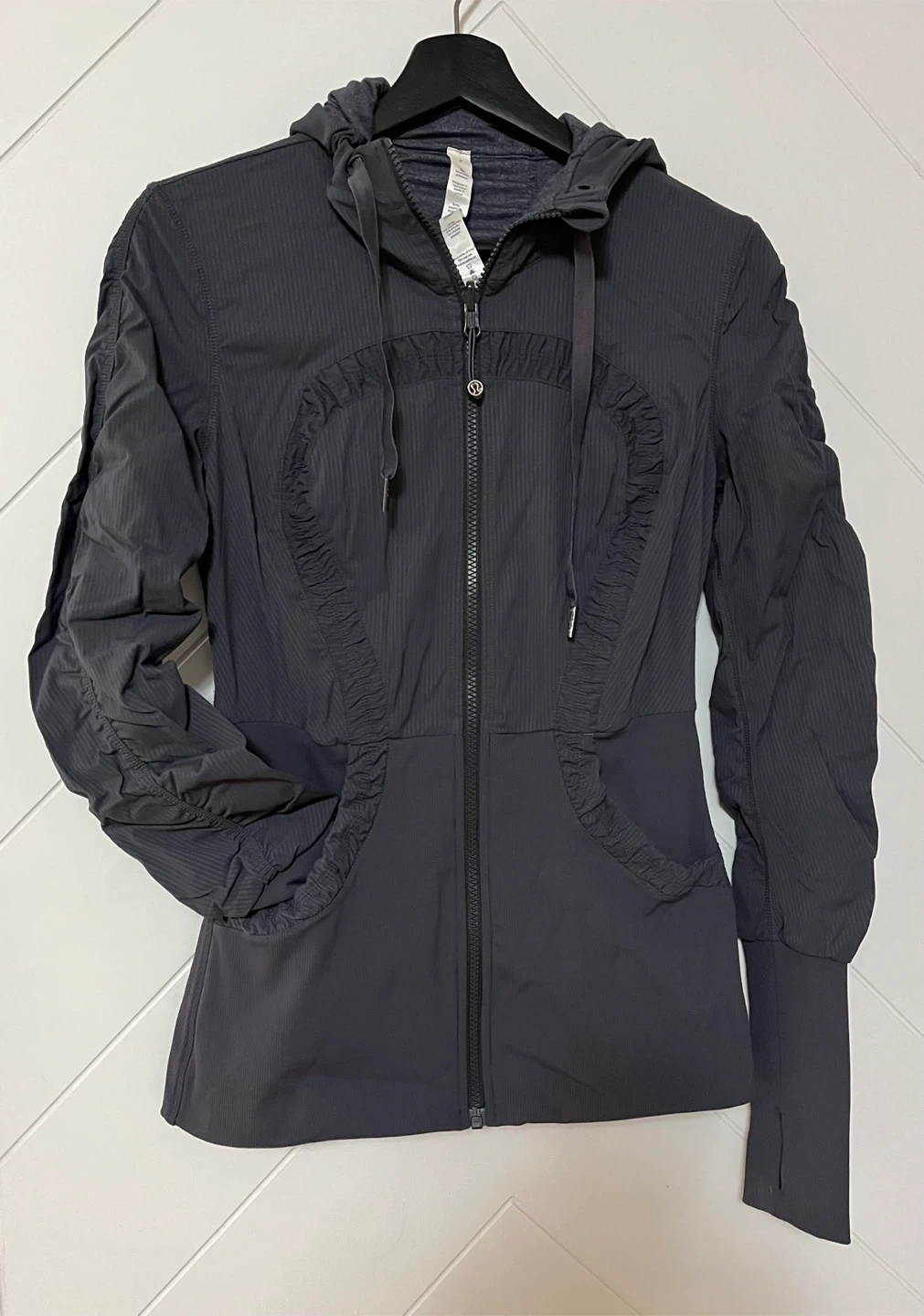 Lululemon reversible hooded jacket in a dark grey colour, full zip closure and ruched detailing on the sleeves and front