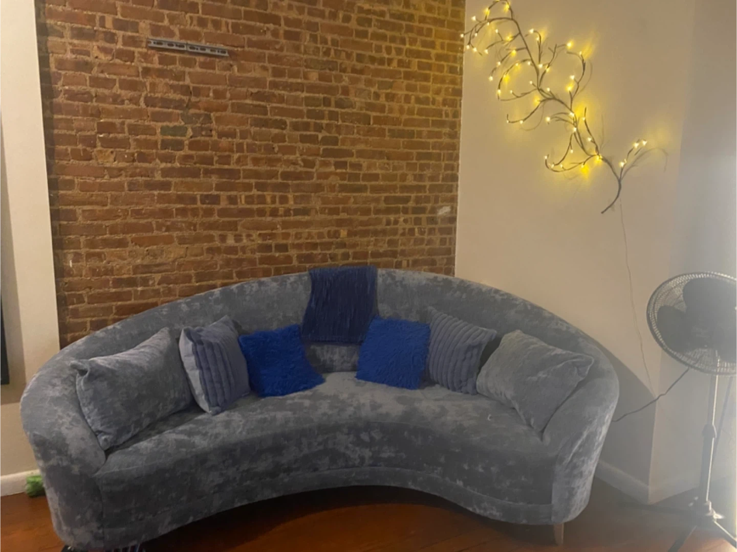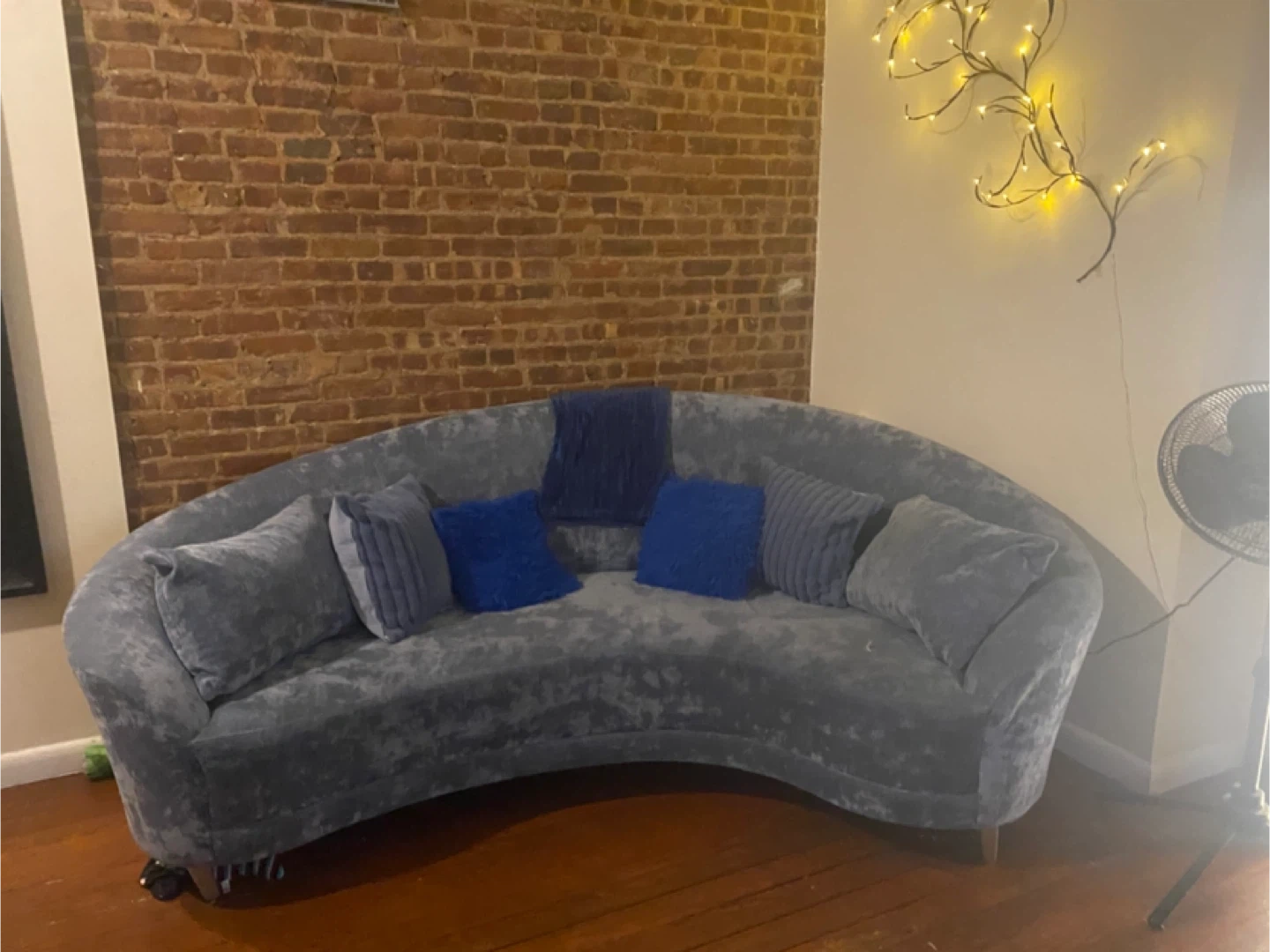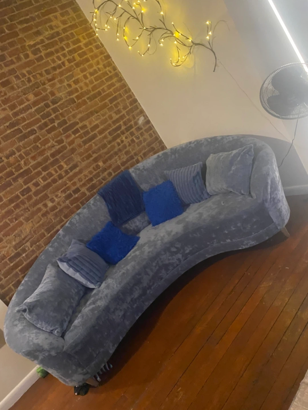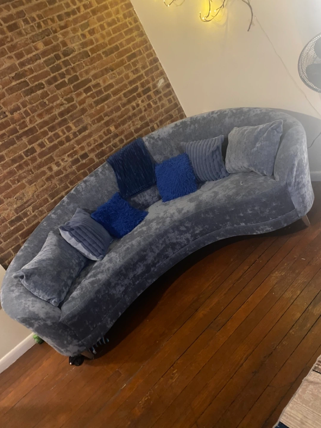 Selling a curved sofa in a gray color. It has a unique design and comes with several throw pillows in varying shades of blue and gray. The sofa would be a great addition to any living room or seating area!
