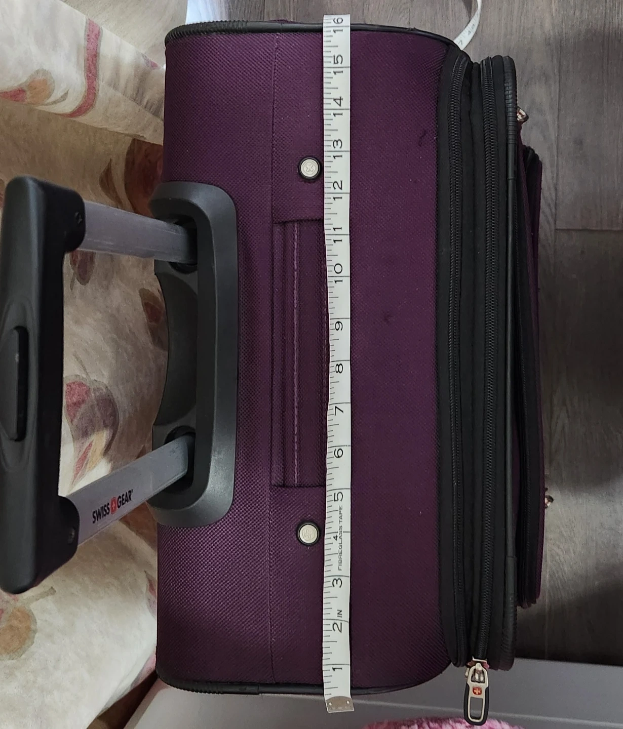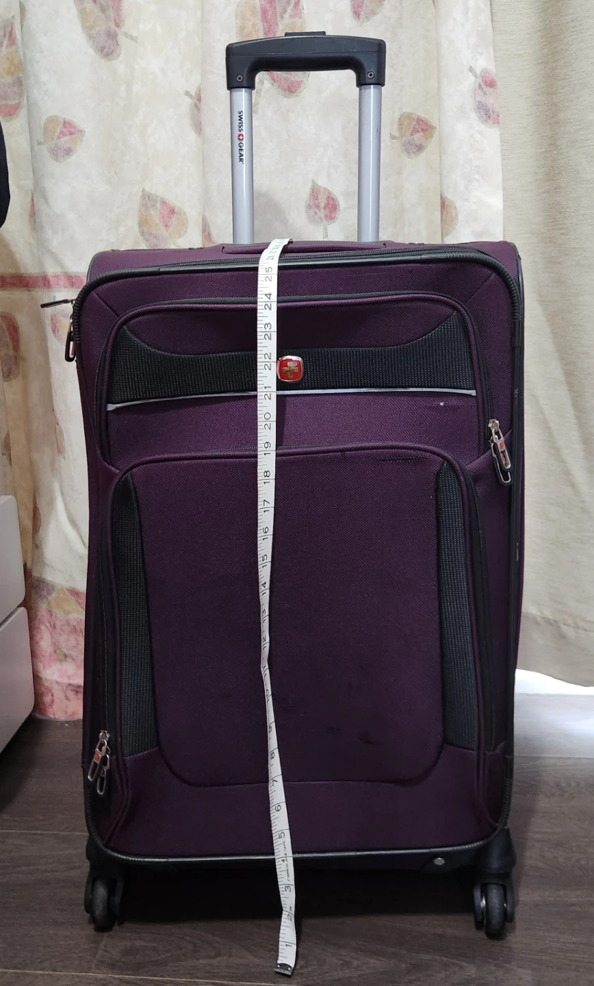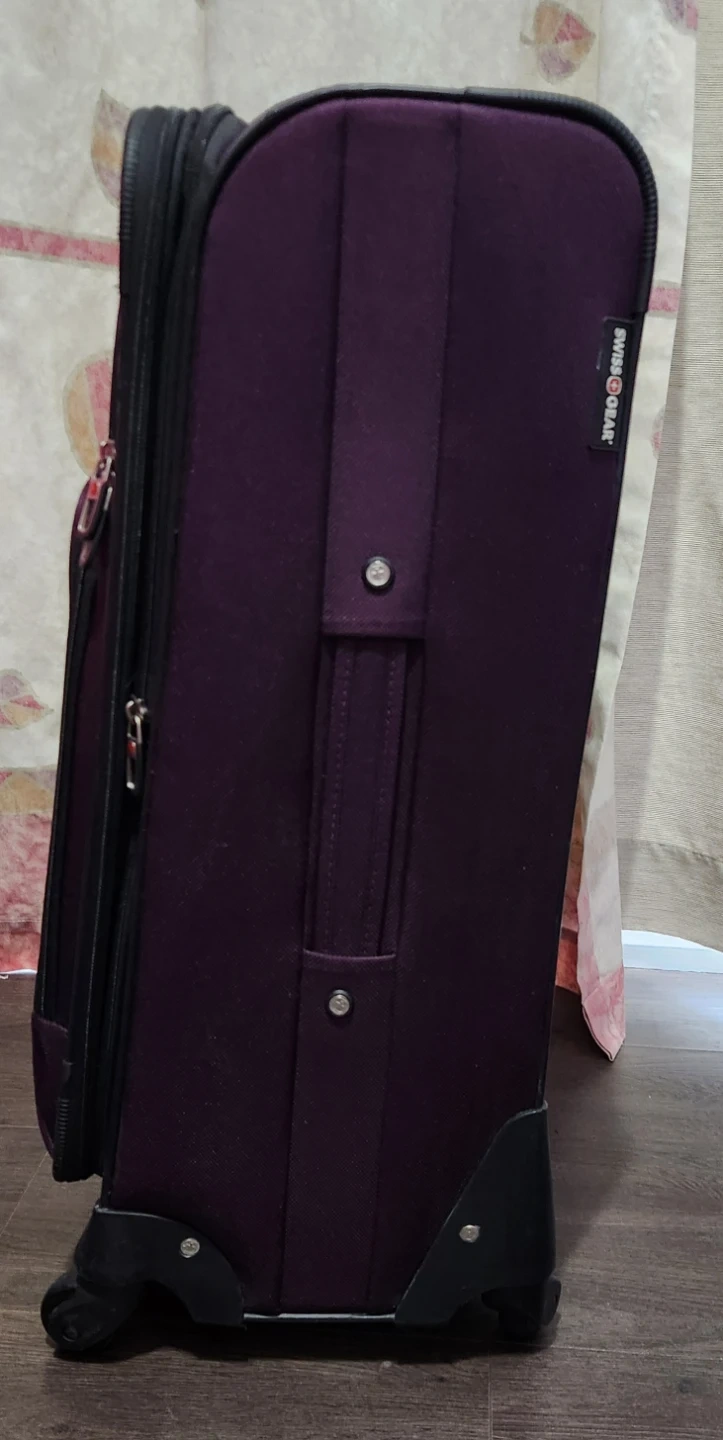 This is a rolling suitcase from Swiss Gear. It's purple and has a retractable handle. The suitcase is made of durable fabric and has spinner wheels for easy maneuverability. Measures approximately 16 inches in width and 25 inches in length.