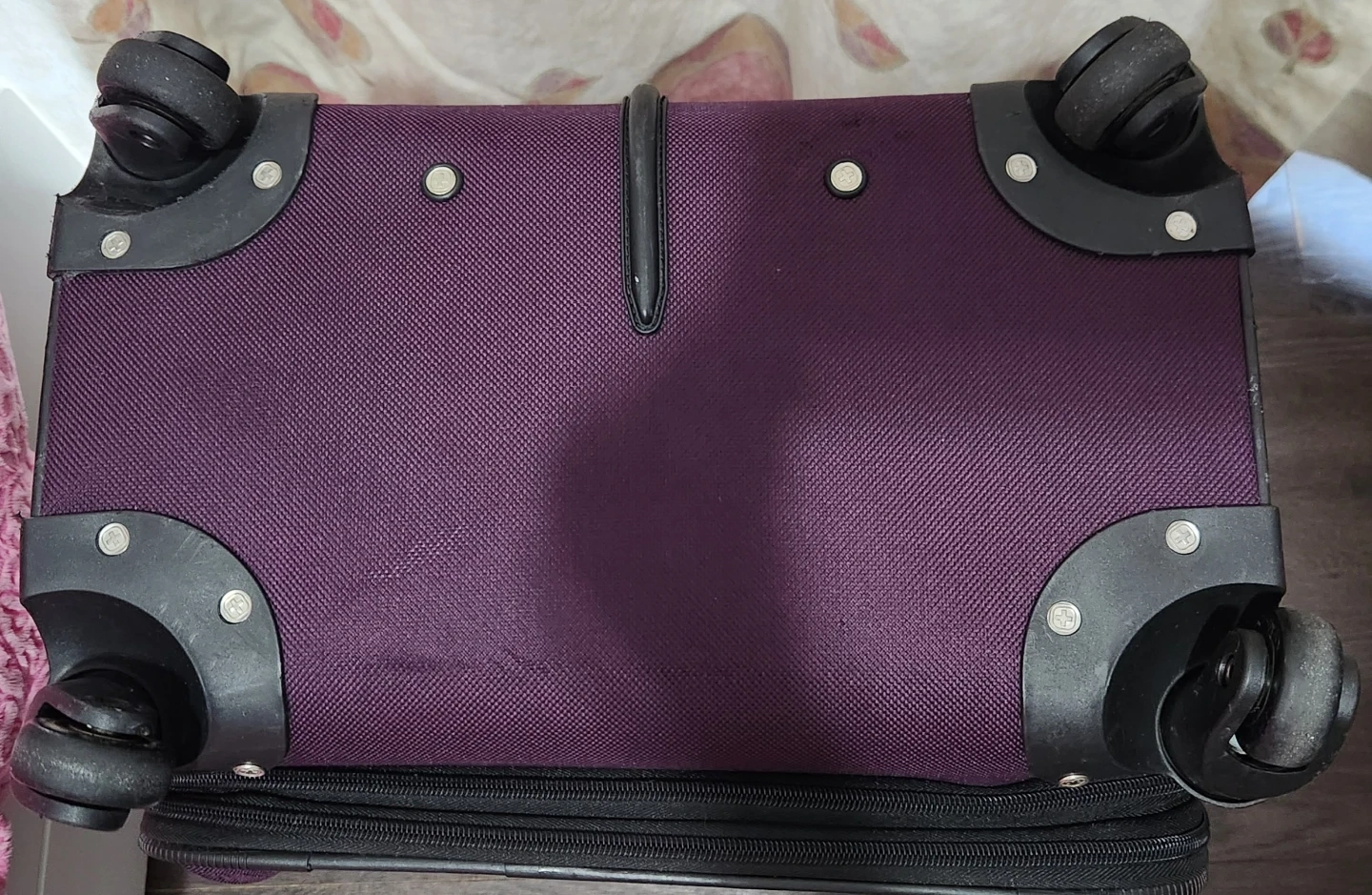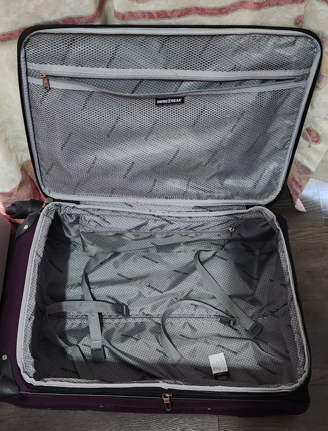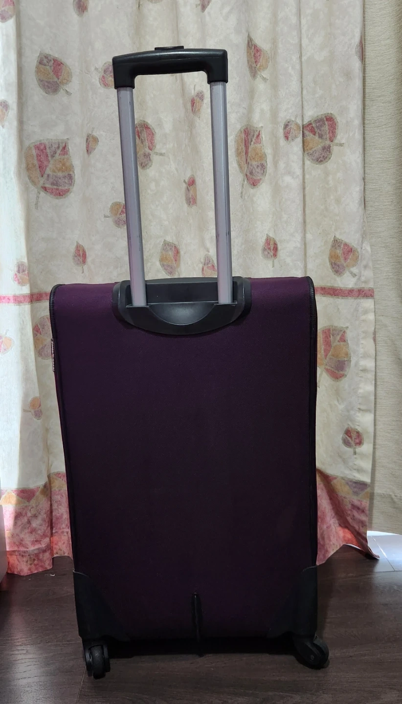 This is a rolling suitcase from Swiss Gear. It's purple and has a retractable handle. The suitcase is made of durable fabric and has spinner wheels for easy maneuverability. Measures approximately 16 inches in width and 25 inches in length.