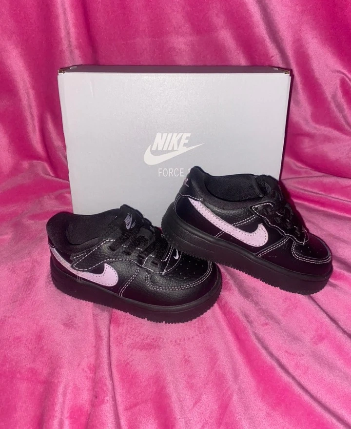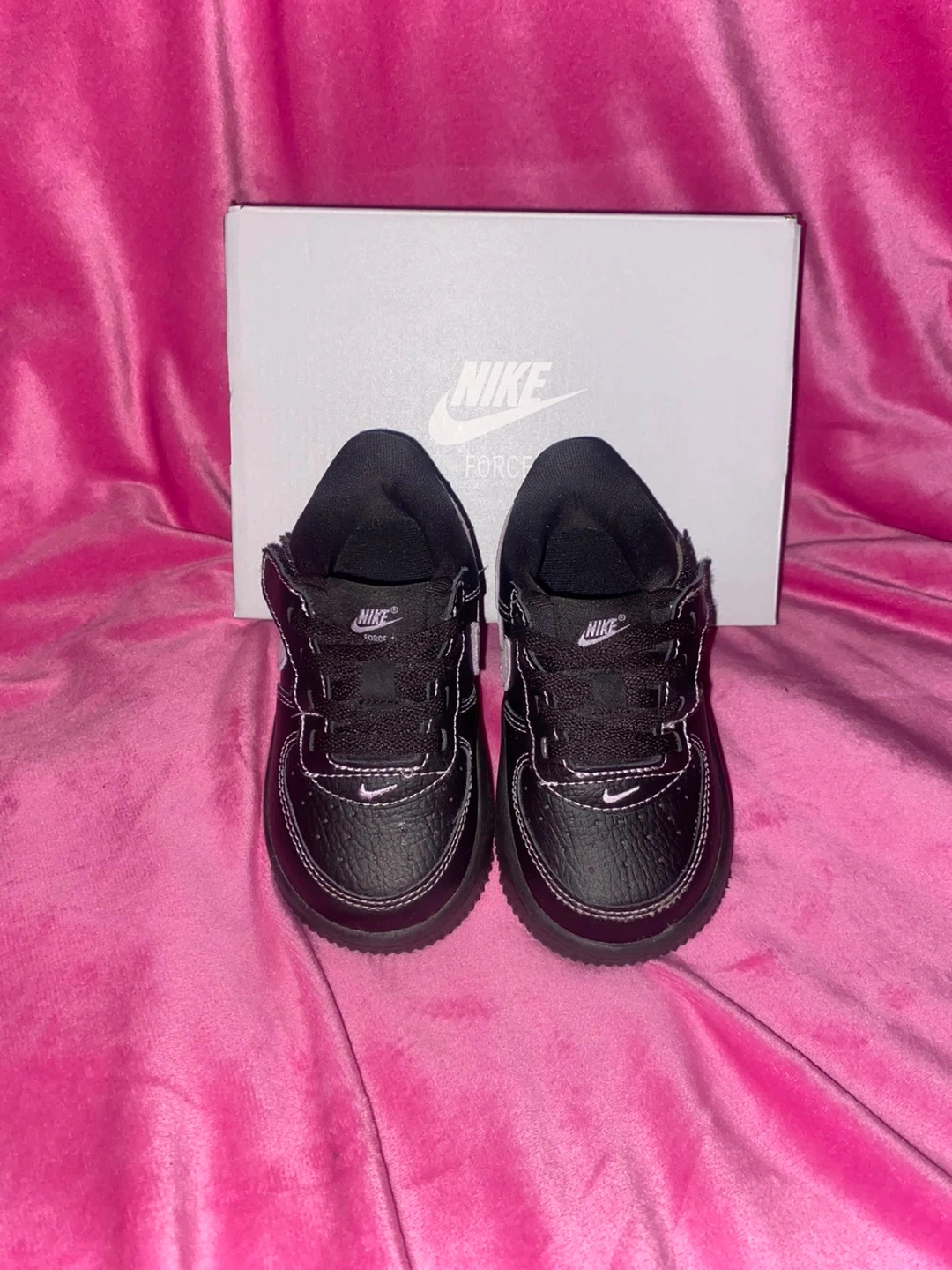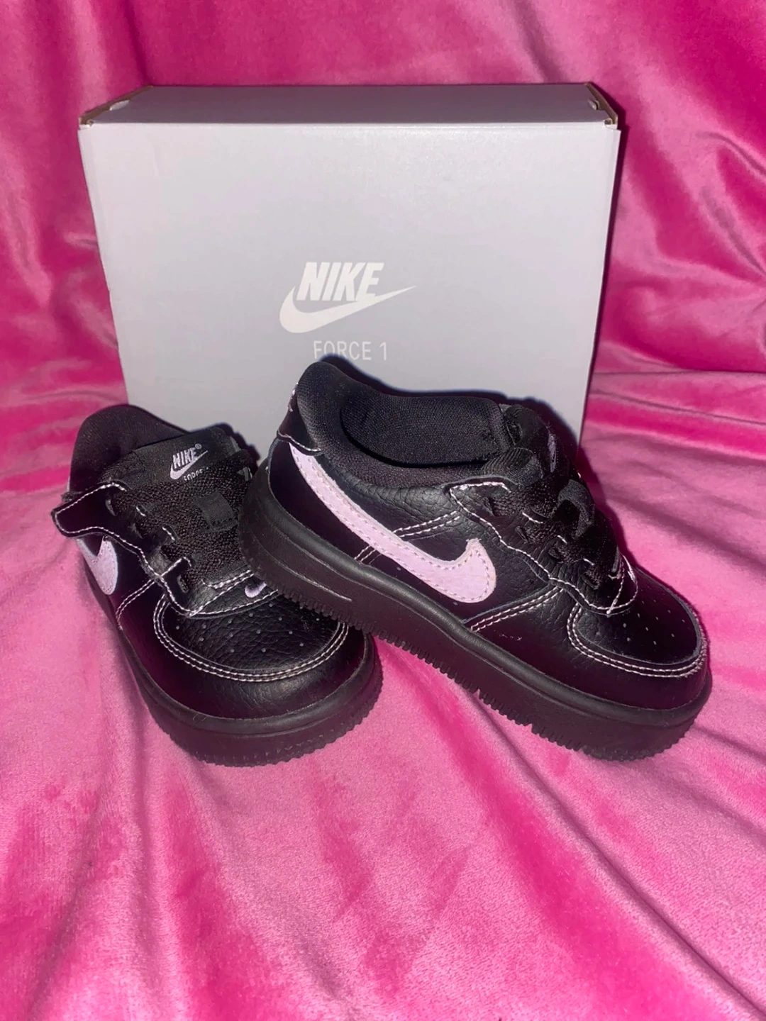 Nike Force 1 Low EasyOn LV8 4 toddler shoes in black with hyper pink accents. Includes original box.
