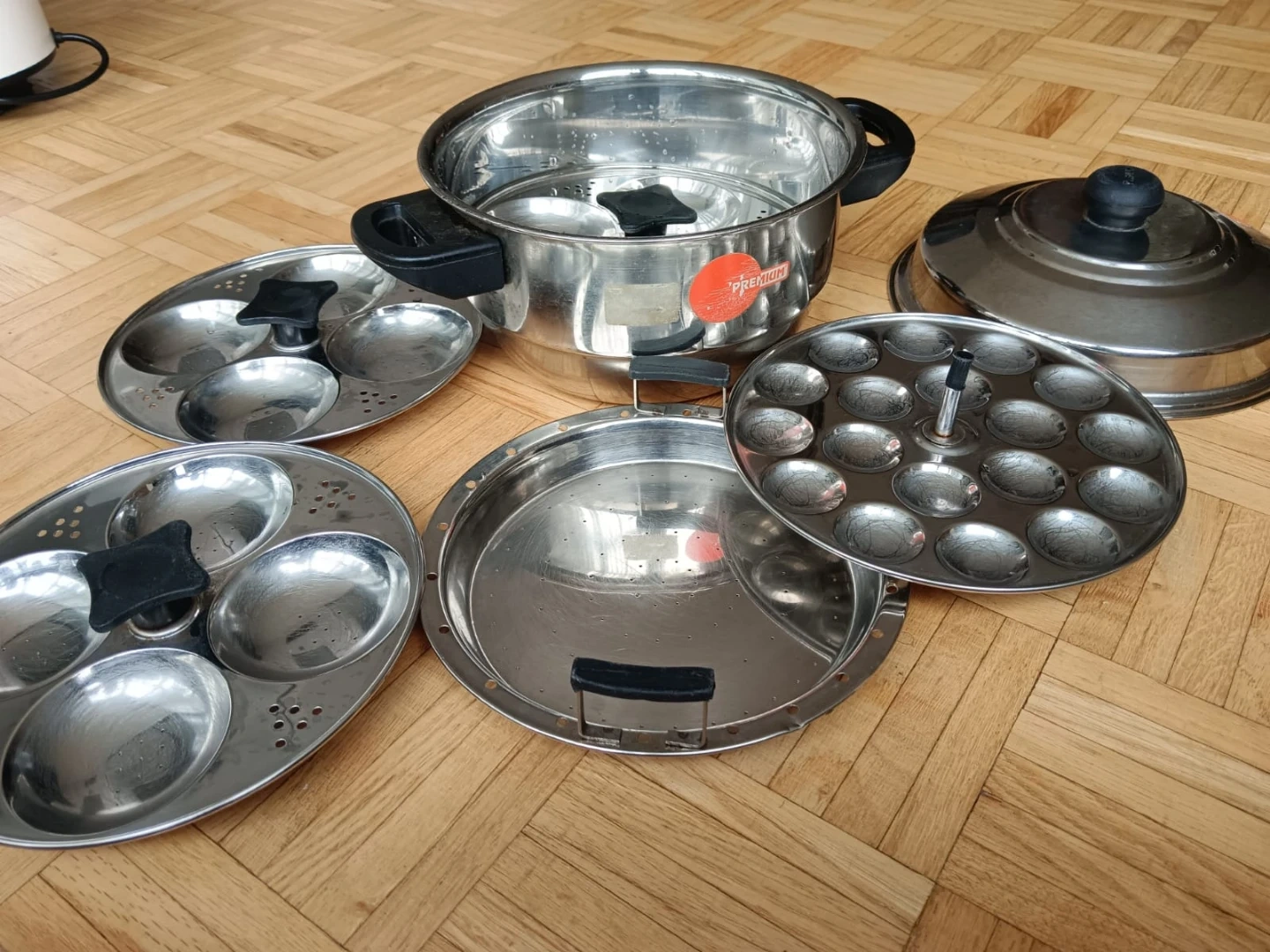 This stainless steel idli maker comes with a pot, steamer, and multiple idli plates. It includes a lid and is made of durable stainless steel. Makes up to 16 idlis at once! Mini idly plate is also included we bought separately.