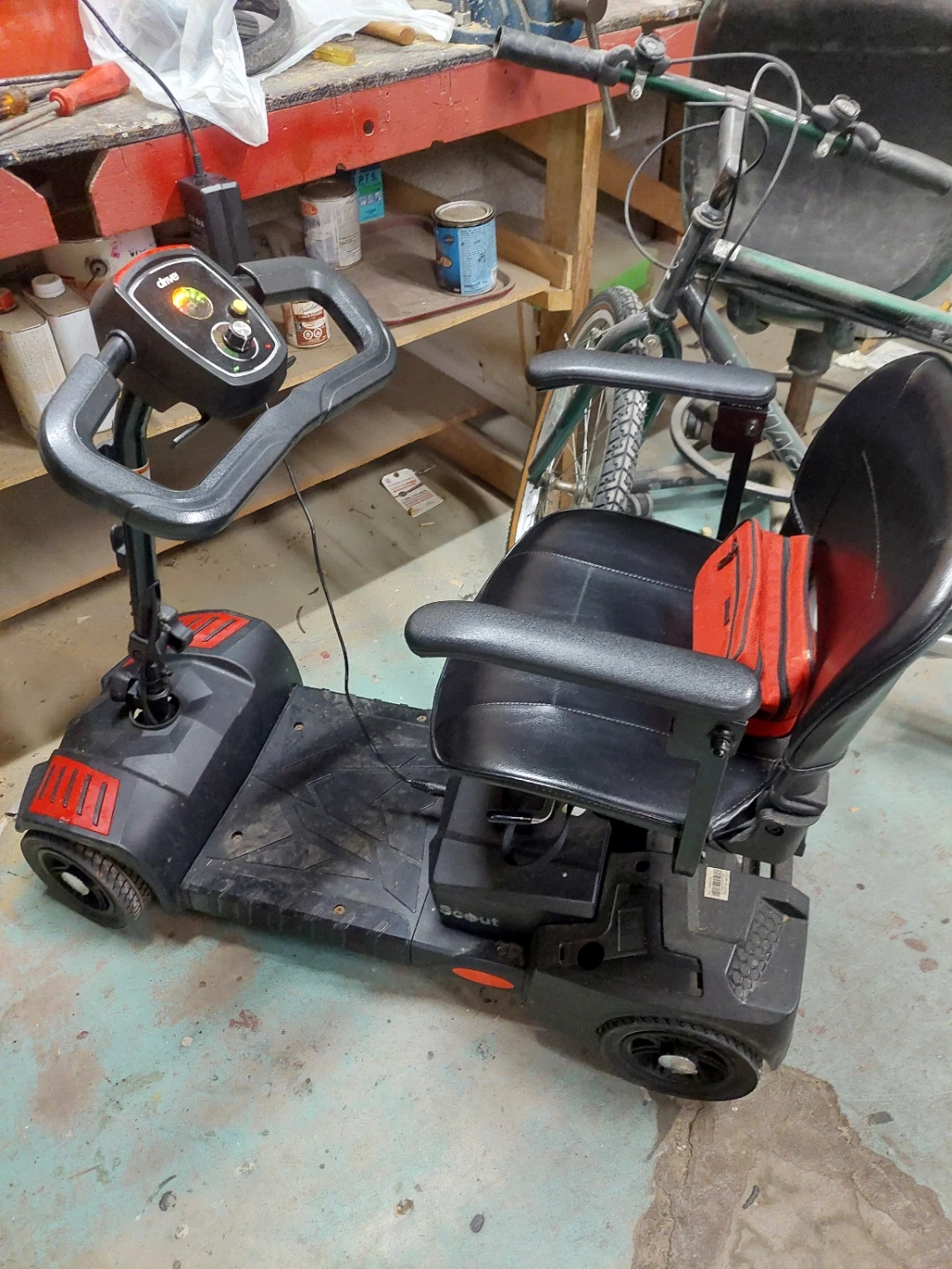 Drive Scout mobility scooter with a comfortable seat. It's black and red with a weight capacity of 250 lbs. This scooter is great for getting around.
