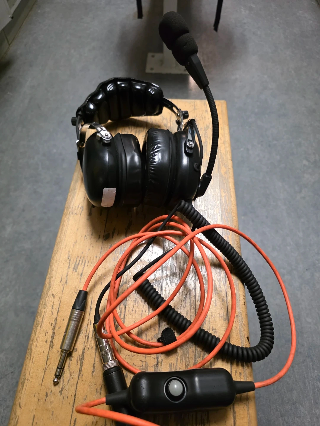 Dalcomm Tech black aviation headset with a flexible boom microphone. It has a coiled orange cable and features 1/4" audio plug with PTT. The earcups are padded for comfort.