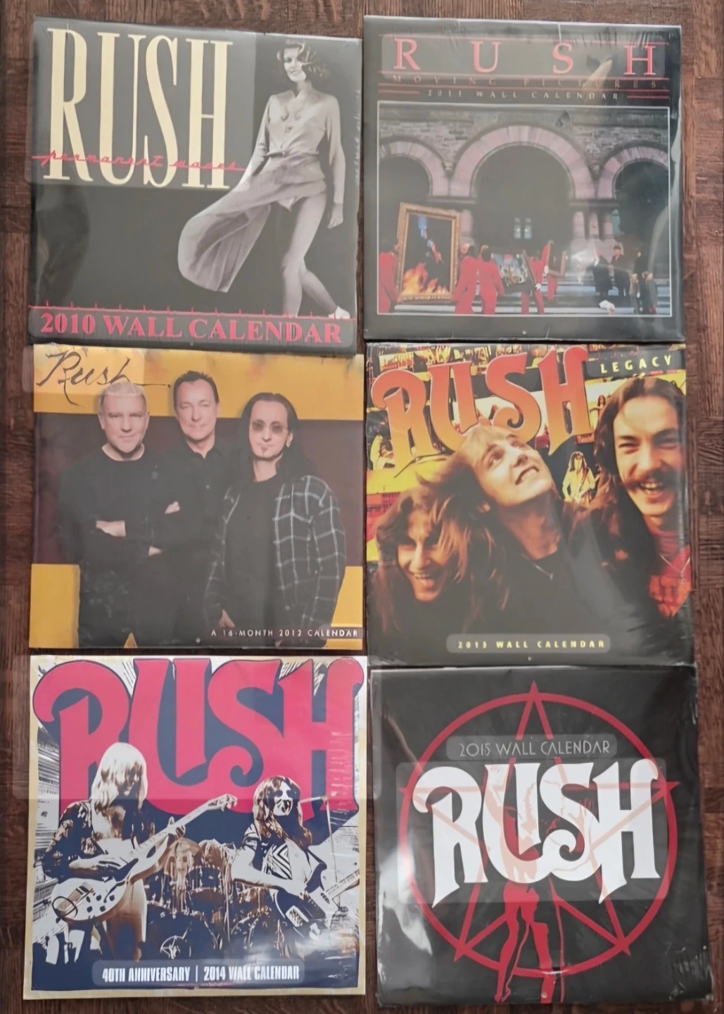 Bundle of five Rush wall calendars from 2010, 2011, 2012, 2013, 2014, and 2015. Includes a 16-month 2012 calendar and a 40th anniversary 2014 calendar. All are new and sealed. These calendars are great for any Rush fan.