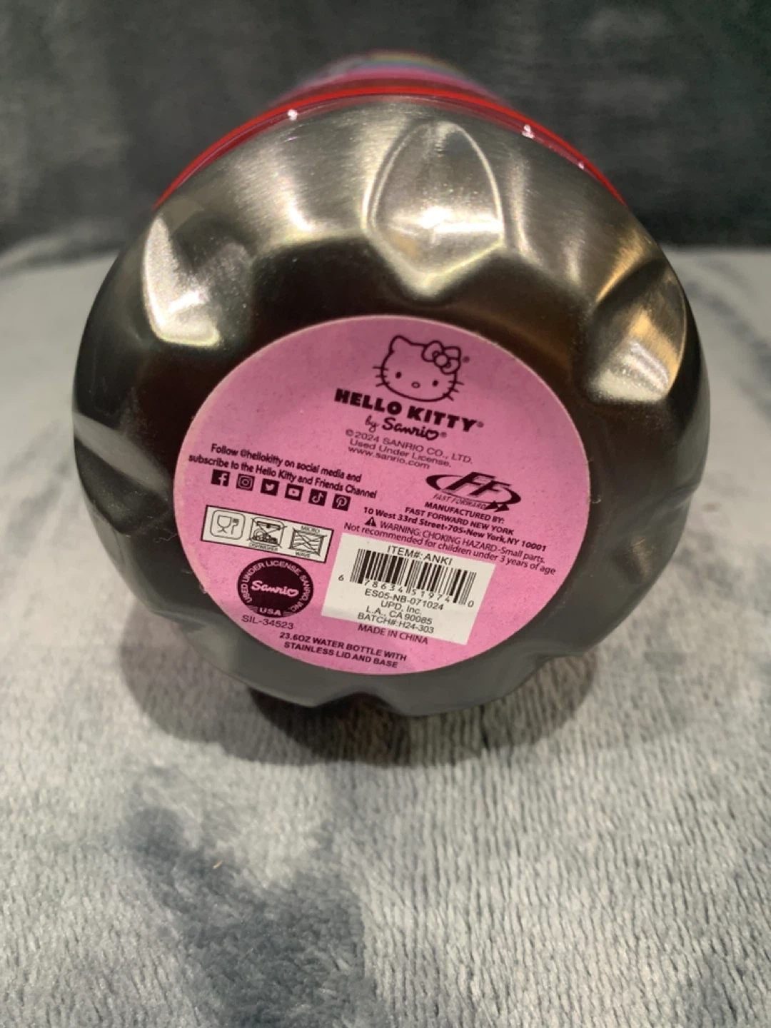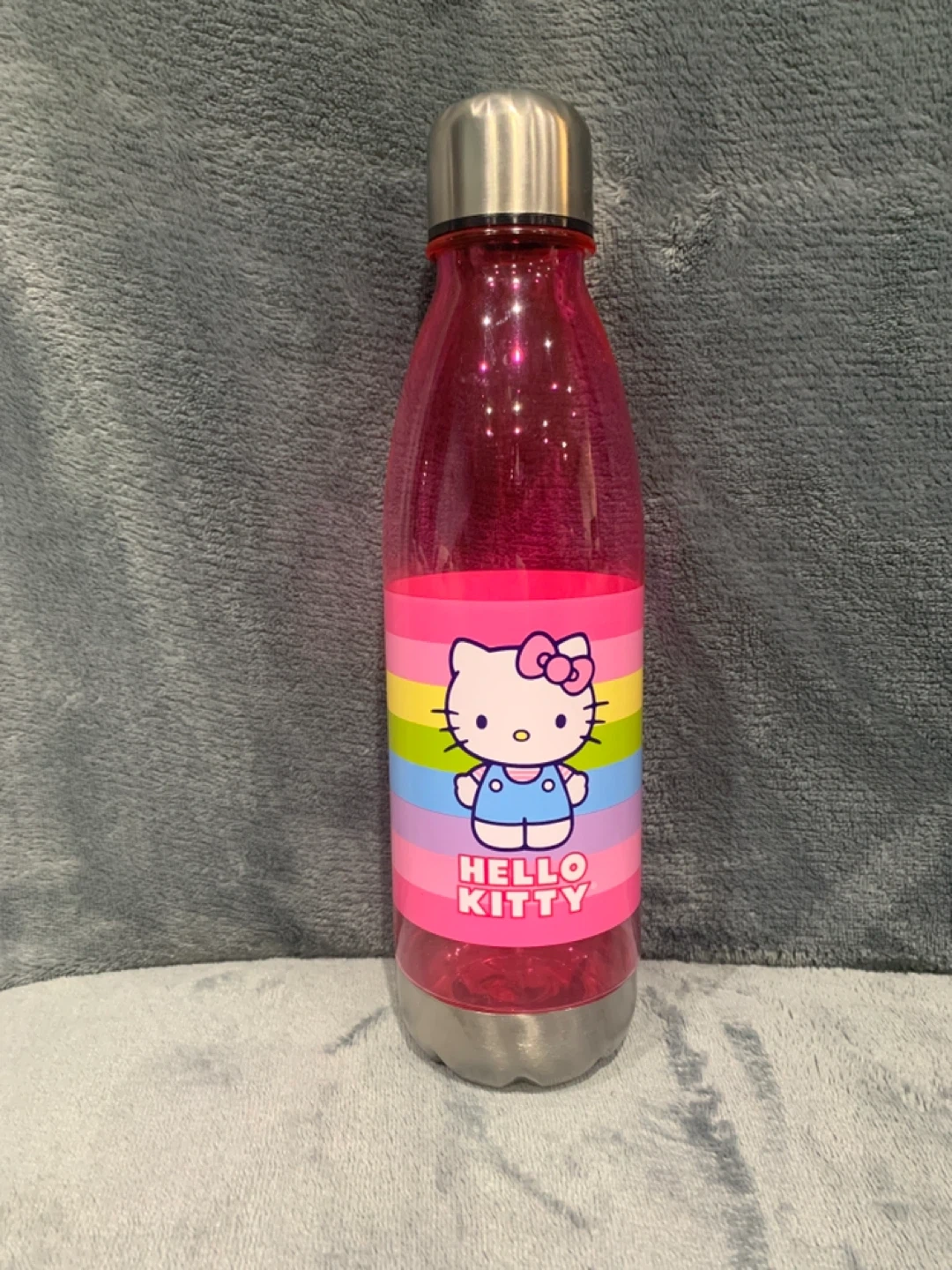 This is a Hello Kitty water bottle made by Sanrio. It's 23.6 oz and made with stainless steel base and lid. Comes with a pink plastic body featuring Hello Kitty and a rainbow stripe.