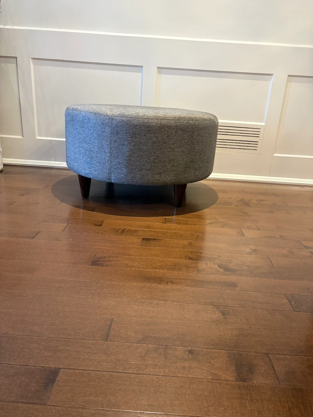 This round fabric ottoman is upholstered in a grey textured fabric. It stands on four dark wooden legs.