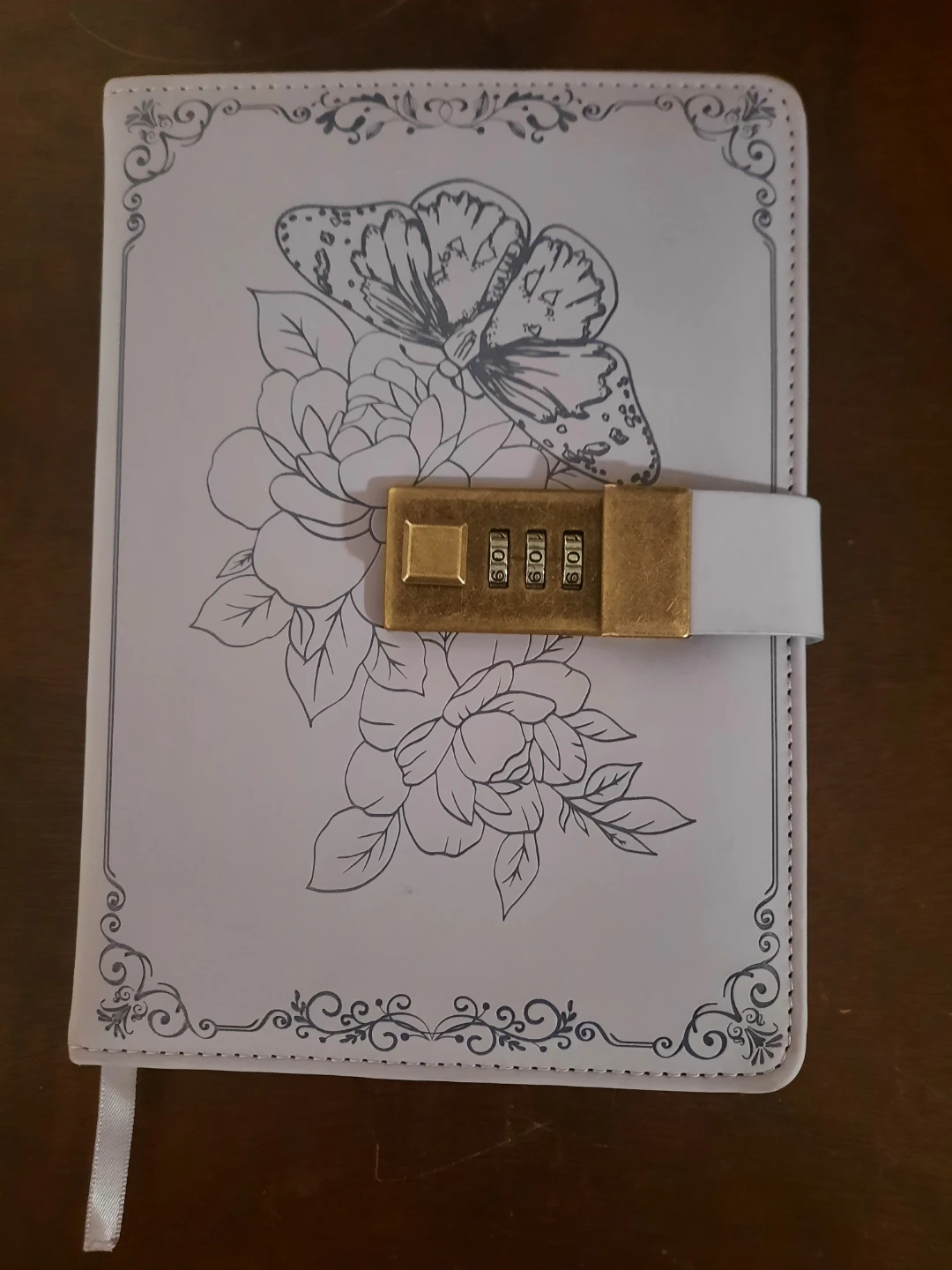 A lovely white notebook-diary featuring a beautiful line drawing of a butterfly and flowers. It's secured with a combination lock for your privacy. A ribbon bookmark is attached for convenience. This notebook is great for journaling or sketching!