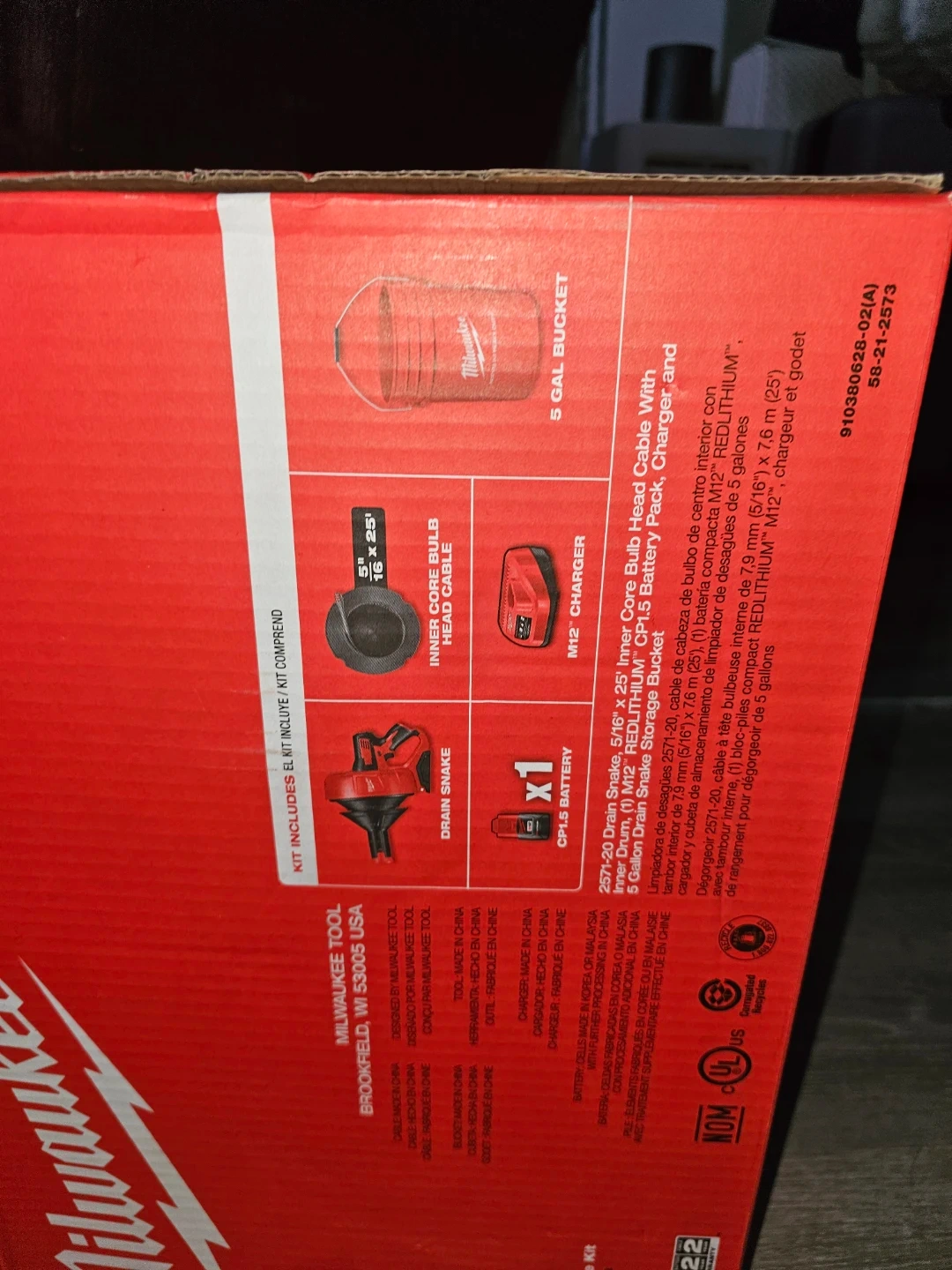 Milwaukee M12 Drain Snake kit includes a 5 Ah REDLITHIUM battery and M12 charger. It comes with a 5/16" x 25' inner drum cable and a 1/2" x 25' drain snake cable. Also includes a 5-gallon bucket and inner core bulb head cable.