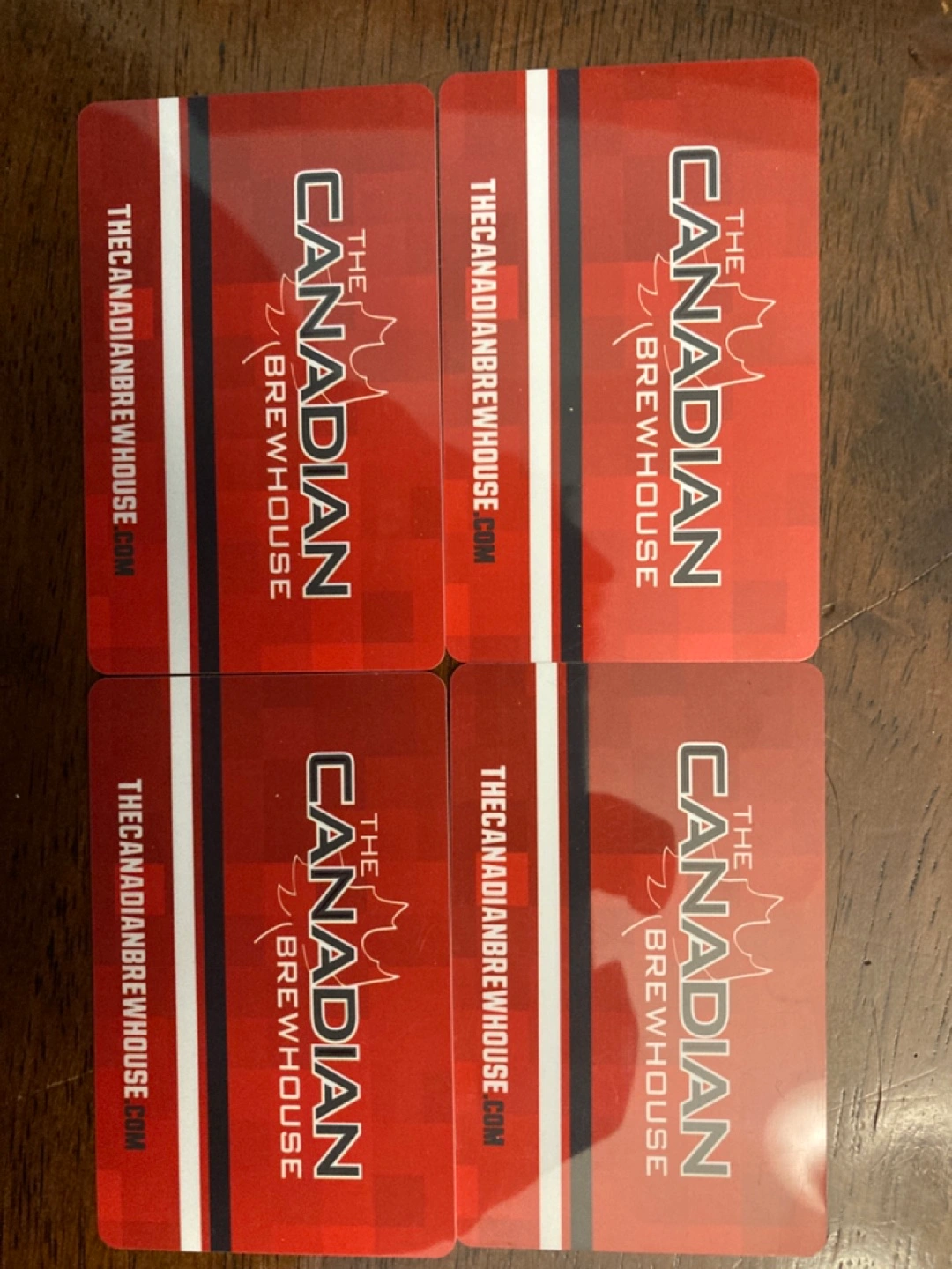 13X4 $50 Canadian Brewhouse Gift Cards $45 for 1 $80 for 2 $155 for 4 Four gift cards for The Canadian Brewhouse. Redeem at any location.